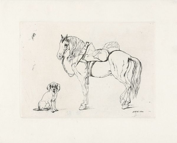 Johannes Tavenraat sketched this ‘Horse and Two Dogs’ with pen in the early 19th century. Here, the horse, depicted with striking ribs, stands as a symbol of raw energy and vitality. The dogs in the foreground, look up to it, perhaps signifying loyalty and domestication in contrast to the untamed spirit of the horse. This image speaks to a long tradition of animal symbology. The horse, particularly, appears throughout history—from the steeds of classical gods to the warhorses of medieval knights, always embodying power and freedom. The skeletal depiction is a motif of mortality, much like the 'vanitas' symbols, reminding us of life's fleeting nature. Consider how these symbols persist and evolve. The horse, once a symbol of raw masculine power, has often been recontextualized in modern times to represent freedom from societal constraints. It is a powerful symbol, engaging us on a subconscious level. The depiction of animals tap into primal instincts and collective memories. These representations transcend time.