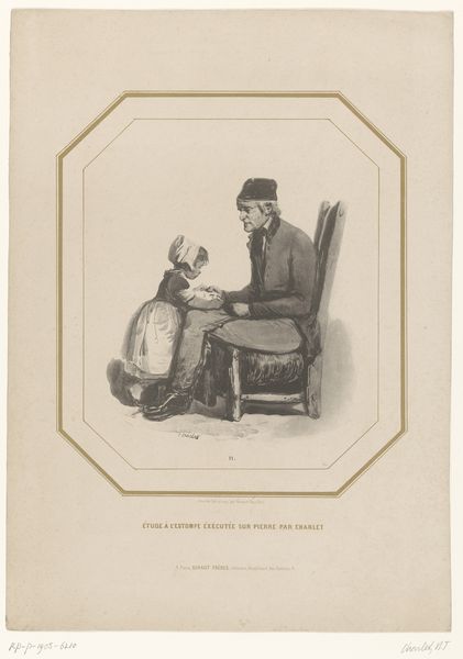 Editor: This lithograph from 1828, by Nicolas Toussaint Charlet, is called "Officier stuurt een dronken soldaat naar het tuchtlokaal," or "Officer Sends a Drunken Soldier to the Guardhouse". It's a pretty small print. I find the depiction of the drunken soldier a bit humorous, almost slapstick in its depiction of inebriation. How do you interpret this work? Curator: This piece provides insight into the socio-political dynamics within the military during the post-Napoleonic era. The caricatured representation of the drunken soldier can be seen as a critique of the rigid hierarchies and discipline imposed on soldiers. The act of sending him to the "tuchtlokaal," or guardhouse, speaks to the dehumanizing aspects of military life and the power imbalances inherent within that system. Editor: So, it's less about the humor of the scene and more about social commentary? Curator: Exactly. Charlet, influenced by the Romantic movement, used genre painting as a vehicle for subtle social critiques. How might the concept of "toxic masculinity" apply to how we view military culture, both in Charlet's time, and our own? Consider how traditional roles of authority are being scrutinized. The act of disciplining could then be a demonstration of authority. Editor: I didn't consider the aspect of toxic masculinity. Viewing it in relation to today's lens does give it another depth. It makes you question the purpose behind it all. Curator: Indeed. What does this work suggest to you about the role of art in questioning societal structures? How does an image like this encourage dialogue about power, discipline, and the individual within an institution? Editor: It highlights that art doesn't need to be grand to provoke thought, that it can be simple with significant meanings. Curator: Precisely!