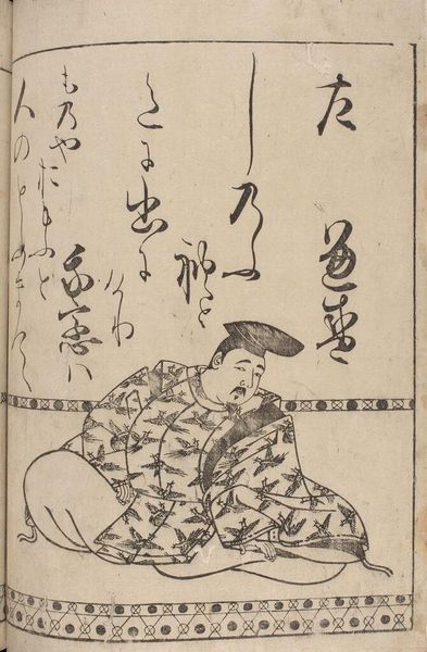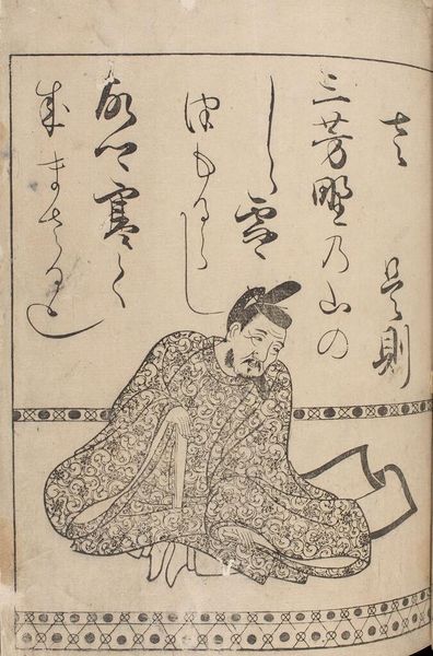 Editor: This is Hon'ami KÅetsu's woodblock print of Ki no Tomonori, from the Thirty-Six Immortal Poets series. The figure feels so self-contained, almost melancholic. What do you see here? Curator: I see a carefully constructed representation of power and cultural identity. How does KÅetsu, centuries later, choose to portray this poet, and what does it say about the evolving role of poets and their relationship to the state and society? Editor: That's fascinating. So, you're saying the image is not just about the poet, but about the cultural values attributed to him? Curator: Precisely! Consider how the calligraphic text interacts with the image, shaping our understanding of the poet's legacy, and the artist's interpretation of that legacy. Editor: I never thought about it that way. It's like the poem, the poet, and the artist are all in conversation across time. Curator: Exactly! And that conversation is ongoing, continuing with us today.