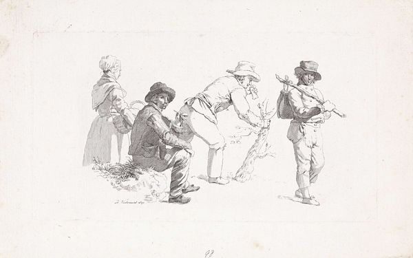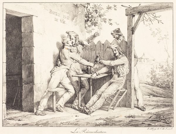 Jacob Ernst Marcus created this etching, "Soldier with raised glass between a woman and a hunter," in 1809. The composition immediately strikes us with its arrangement of figures around a central barrel, creating a sort of stage. Marcus masterfully uses line to define the forms and textures, from the soldier's crisp uniform to the more rustic attire of the hunter. The scene is meticulously constructed, with the soldier, the woman and the hunter, each rendered with distinct detail. Notice how the lines around the soldier are more defined than the softer lines that define the woman, perhaps indicating the soldier’s superior position in society. The poses and interactions are deliberately choreographed, setting the tone of merriment, of a brief respite. Here, the linear precision doesn’t just depict a scene; it constructs a narrative about social roles, leisure, and the transient moments of human interaction. The texture adds depth, inviting us to contemplate the story embedded within.