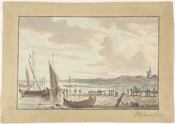 Curator: This is "Rivierlandschap" or "River Landscape" by George Andries Roth, likely created sometime between 1819 and 1887. It's currently held here at the Rijksmuseum. Editor: It has a certain tranquil quality to it, a sort of wistful silence in monochrome. The gray-brown tones give it a somber atmosphere, almost melancholic. Curator: I see what you mean. There is definitely a subtle atmosphere here. It's a mixed-medium drawing created with pen, ink and watercolor techniques. Look how Roth employs light and shadow. The trees on the shore in the mid-ground stand for life and perhaps wisdom through age, leading to the distant promise symbolized by the calm waters. Editor: It’s fascinating how the various materials converge. Roth deftly employs etching as a critical visual ingredient to build dimension with line density. This allows the viewer to read form. It’s this labor that then ascribes the finished composition a greater level of prestige. He's definitely aiming at a realistic representation of a particular locale. Curator: Precisely. It resonates with a desire for naturalism characteristic of the 19th century, attempting to evoke a feeling and connection to the pastoral, or the experience of seeing. Notice also, though perhaps smaller, how two figures occupy the far-left, seeming to gaze towards the body of water ahead of them, beckoning and offering guidance. Editor: Interesting that they’re so understated in their application of labor. However, the artist employs familiar, conventional components within the landscape to reinforce established beliefs in Dutch painting—of humans as industrious and active elements in taming land, rather than prioritizing the majesty of untouched nature. Curator: That’s a clever observation regarding the implied industriousness, I believe there is some element of cultural narrative present here. The landscape isn’t purely about the vista itself, but about imbuing it with a sense of history, and memory passed down through generations, to include some kind of didactic imperative about our connection to place. Editor: Right. Thinking about its historical and economic context brings another angle into view. Curator: Absolutely. Thanks for guiding us through this image, your eye toward technique and context has made for a particularly compelling look at this beautiful landscape. Editor: It's been a pleasure exploring it with you; it is striking to consider how the history of production methods is integral to its cultural impact.