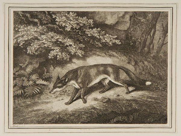 Curator: Samuel Howitt gives us "Otter Hounds," a print that captures a dog wading into water, its posture alert. I'm drawn to the stark contrasts. Editor: There's an almost allegorical quality to the composition; it feels poised between domesticated life and the wild. Curator: The printmaking process itself—etching, perhaps—allows for these incredibly fine lines. Howitt’s labor becomes a translation of the animal's alertness into graphic form. Editor: The dog as a symbol of loyalty and vigilance, entering the unknown. It evokes a sense of both anticipation and trepidation. Curator: Howitt's artistic labor mirrors the labor of the hunt, domesticating nature through both image and activity. The print is a commodity tied to class and leisure. Editor: And in that tension, between control and instinct, lies a powerful representation of human-animal interaction. Curator: Indeed, a complex interplay, expertly rendered. Editor: A lasting image, even now.