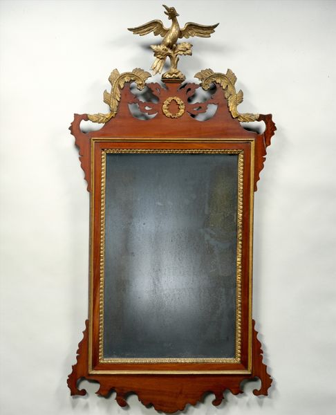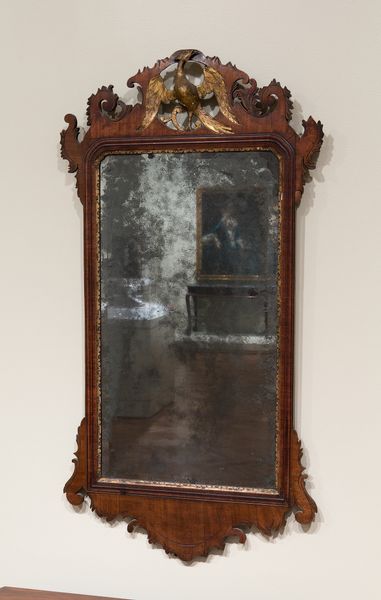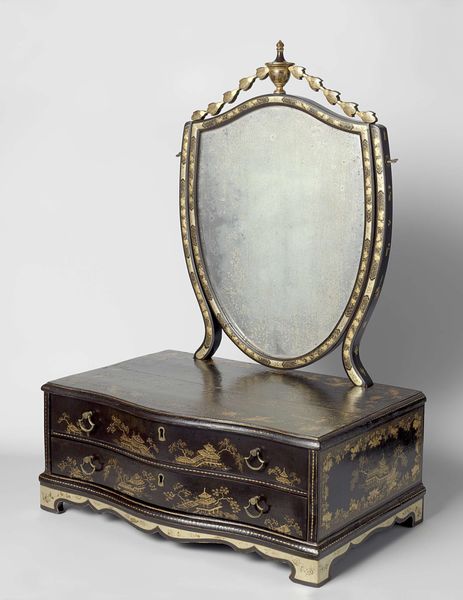 Curator: Looking at this piece, I feel a bit overwhelmed—but in a beautiful way! There's so much happening on this frame, a storm of ornamentation. What’s your take? Editor: Indeed! Let’s contextualize this dazzling work. We're examining a frame, created circa 1690 to 1700. It currently resides in the Rijksmuseum. A remarkable example of Baroque craftsmanship. Curator: Baroque! It's fitting; the ornate detailing definitely shouts opulence. I’m immediately drawn to the contrast between the detailed carvings of what looks like flowers and cherubic figures against the smoothness of the frame. Do you think that contrast adds to its appeal? Editor: Absolutely, contrast is crucial. It exemplifies a hierarchical interplay: The eye navigates from the immediate surface to the dense ornamental reliefs—inducing optical intrigue while directing the viewer toward the center, inviting introspection. Semiotically, this interplay encourages engagement. Curator: You lost me a little with the semiotics, but I definitely get what you mean. The way light and shadow play across the relief work pulls the viewer into this miniature world carved in stone. Is it stone? Editor: Most likely, yes. Perhaps dark wood polished to evoke the qualities of natural stone—an ingenious way to capture and distort ambient light. I suspect a dark hued hardwood as the substrate with gesso or plaster underpainting. This frame, conceived for opulent settings, reflects power, prestige and the social performance emblematic of the Baroque epoch. Curator: It also gives me a feeling of weight. Both literal, since it’s such dense carving, and symbolic. This isn’t something light. Did every house back then have a mirror like this, or was it just for the really, really rich? Editor: Rarity certainly bolstered exclusivity. These details required specialized artistry that signified status. The integration of natural motifs alludes to the influence of exterior realms on indoor decoration trends amongst affluent 17th century Netherlands patrons. Curator: Reflecting upon the piece, I feel as though the craftsman poured their whole heart and life into this frame, this object to hold an image, maybe even reflect an image of themselves, just, it would never, ever happen these days, right? Editor: The piece exemplifies both individual skill and broader cultural mores regarding ornamentation and representation. A wonderful, evocative statement, indeed!