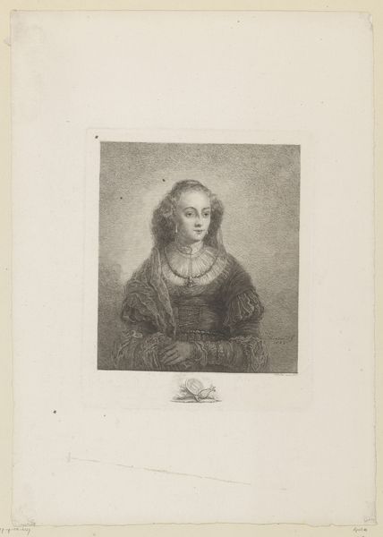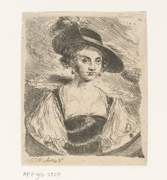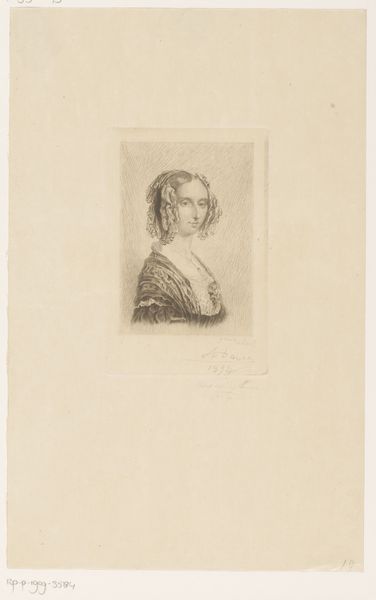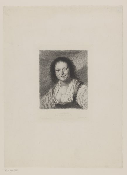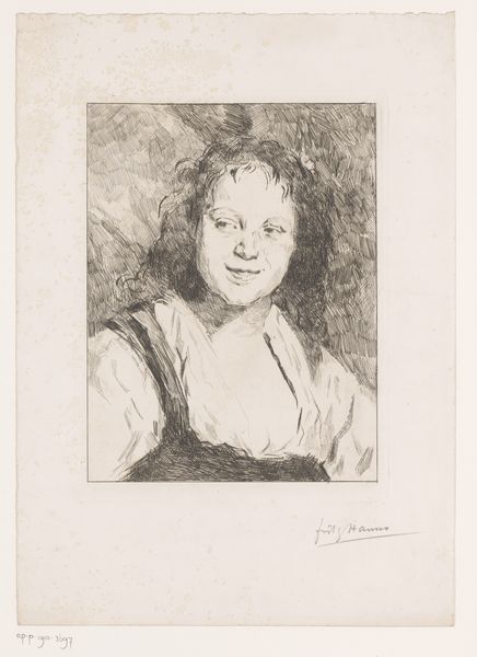 Editor: Here we have "Portret van een onbekend Roma meisje" by Frans Lauwers, created sometime between 1864 and 1911. It's an etching, giving it this really intricate, almost scratchy texture. The young woman's expression is really captivating. What elements of composition and technique strike you most in this piece? Curator: The piece demonstrates a fascinating interplay of line and shadow. Note how the artist meticulously builds volume and form using hatching and cross-hatching. Consider the directionality of these lines – how they sculpt the contours of her face, the fall of her hair, and the folds of her clothing. Editor: It's like he's drawing with light itself! Is that selective highlighting drawing our eyes where the artist wants them to go? Curator: Precisely. The areas of high contrast – the bright reflection on her cheek, the shadow under her chin – serve as focal points, guiding the viewer's gaze and accentuating the emotional depth of the subject. What sort of effect do you think this produces? Editor: I guess it adds to that captivating quality, drawing me into her space somehow. The textures create the illusion of something tangible, even though it's just ink on paper. I wouldn’t have initially picked up on the interplay of line, but you’ve shown me how those create focal points and add dimensionality to the form, emphasizing the emotional depth of the subject. Curator: Exactly. Analyzing these elements brings us to a deeper understanding. There's real artistry in translating form and feeling through such controlled use of a single medium. Editor: Definitely. I’ll look at prints completely differently from now on.