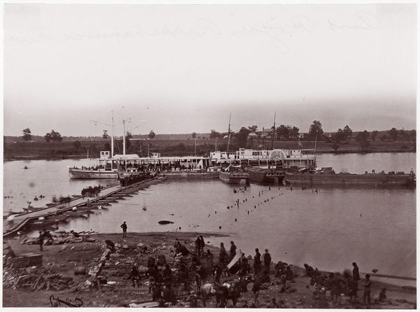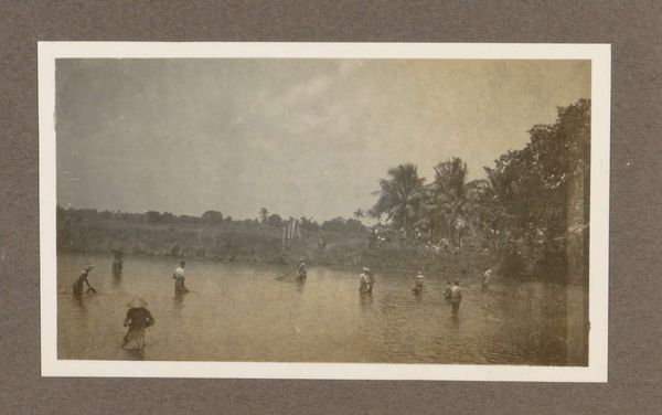 Editor: This photograph, "Vissers staand in ondiep water in Nederlands-Indië," or "Fishermen standing in shallow water in the Dutch East Indies," was captured by Klaas Kleiterp, likely sometime between 1920 and 1930, using the gelatin silver process. The figures standing in the water seem so vulnerable against the backdrop of the landscape, but I wonder what this scene says about the relationship between the colonizer and the colonized. What is your take on this? Curator: This photograph offers a lens into the complicated relationship between the Netherlands and what is now Indonesia during the colonial era. These types of images were often used to portray a romanticized, even exoticized, vision of life in the Dutch East Indies to audiences back home. What role did photography play in constructing this view of "the other"? Editor: That's a great point! I guess the camera's gaze wasn't necessarily objective, it may have been involved in the exoticisation of other culture through image production. It makes you question what the photographer’s intentions may have been. What exactly were they trying to convey with these images of people fishing? Curator: Precisely. We must consider how images like this functioned within the broader context of Dutch colonial power. They could be seen as ethnographic documents, but also as instruments of control, shaping perceptions and justifying colonial policies. These scenes might look natural, but how authentic are they when considered as promotional material of a dominating country? What happens when you center on people as just elements in an exotic scenery? Editor: That is really fascinating, seeing this less as a pure landscape and more as a commentary on power. Thank you for offering this new understanding on colonial imagery! Curator: It highlights the importance of considering the power dynamics embedded within seemingly simple depictions of everyday life. I leave considering this same question when appreciating any other type of artwork as well!