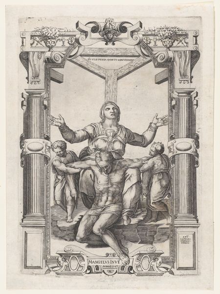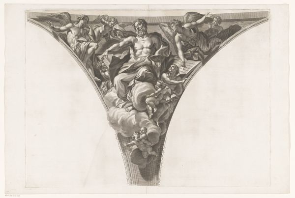 Editor: Okay, next up is "Two Angels Supporting a Cartouche or Shield" made by Orazio de Santis sometime between 1568 and 1577. It’s an engraving, so a print. It’s really interesting—the figures are so sculptural, but the overall composition feels a bit...stiff. What can you tell me about this piece? Curator: What stands out to me is how this image would have functioned within the broader social and political landscape. The cartouche, a blank shield, suggests this was intended to be customized, right? To broadcast power and status. It was an era defined by religious conflict and dynastic struggles. Consider where prints like this would circulate – among the elite, within court circles. Editor: So, not just art for art’s sake, but more like... propaganda, maybe? Curator: Not necessarily propaganda, but definitely imagery serving a purpose. The Baroque style emphasizes drama, but controlled drama. The angels, while seemingly pious, are also symbols of authority. The image aimed to associate whoever commissioned this with divine blessing and refined taste. Do you think its symbolism and use helped or hindered it as art? Editor: I hadn't thought about the target audience, but I see that the artistic merits might've been secondary to communicating status or authority. Fascinating. Thanks for giving me something to think about. Curator: The intersection of art and power is always complex, which I find thought-provoking about Renaissance art. Focusing on its context enhances our appreciation for it.