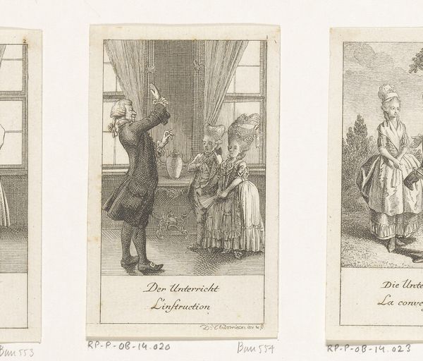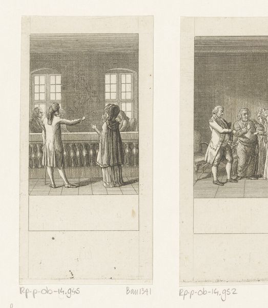 Daniel Nikolaus Chodowiecki created this print, "Macbeth probeert de profetie van de heksen te ontlopen," using etching techniques. Notice the two distinct scenes set within clearly defined borders. The left scene is structured with a receding orthogonal perspective, drawing our eyes to the vanishing point near the arched doorway. This architectural structure contrasts sharply with the dynamic grouping of figures in the right panel. Here, the artist uses light and shadow to enhance the spectral presence of the witches. The composition, while still perspectival, is more energetic, with figures gesturing dramatically around a banquet table. Consider how Chodowiecki uses these compositional elements to underscore the narrative tension. The stark contrast between architectural stability and chaotic human drama reflects the play's themes of order and disruption. It's a dynamic interplay between form and content, where the artist's structural choices amplify the drama's philosophical underpinnings.