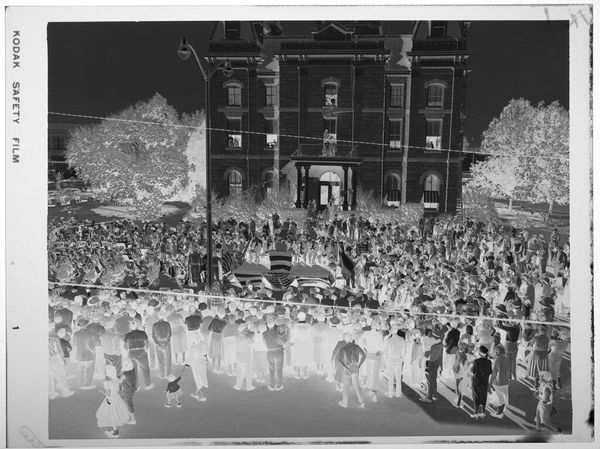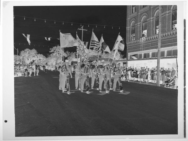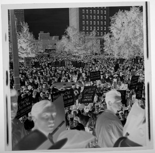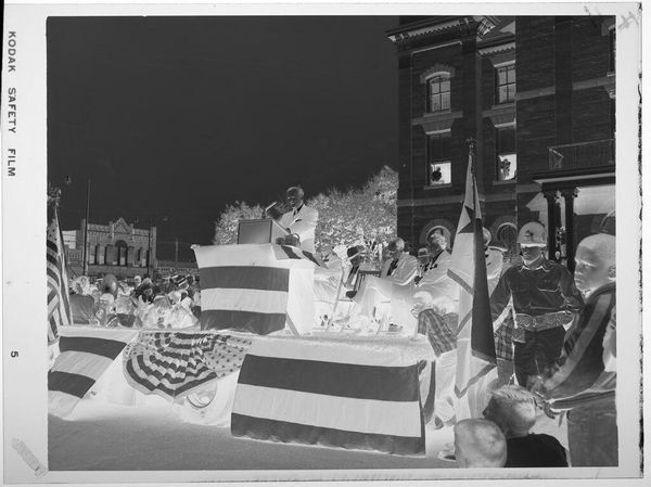Editor: This photograph by Harry Annas, titled "Untitled (man speaking at outdoor podium draped in U.S. flags)", presents a striking scene. I’m really drawn to the sharp contrast between the dark sky and the light podium. What formal qualities stand out to you? Curator: Indeed. The photograph uses stark tonal inversions, demanding a close consideration of light and shadow. Notice how the American flags become abstract shapes, their symbolic power somewhat muted by the negative exposure. Editor: It almost renders them into simple lines and curves. Is the absence of color a deliberate choice? Curator: Undoubtedly. The lack of color shifts the focus to form and texture, emphasizing the composition itself. The flatness also removes any illusion of depth, highlighting the artifice of representation. Editor: So, the photographic technique itself becomes part of the message? Curator: Precisely. The medium, in this instance, is deeply intertwined with the message it conveys. It’s a compelling exercise in visual semiotics. Editor: Fascinating! I’ll certainly look at photography differently now. Curator: As will I.