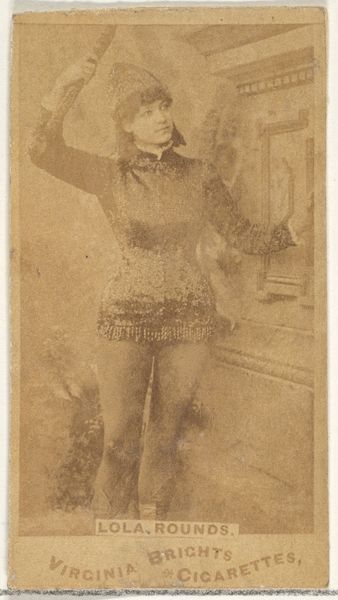Editor: This is “Annie Somerville, from the Actors and Actresses series (N171) for Old Judge Cigarettes,” dating from 1886 to 1890. It's a small printed card, now held at the Met. What strikes me most is the sheer disposability of it; it was designed to be included with a pack of cigarettes! What do you make of it? Curator: It's fascinating how something so seemingly ephemeral as a cigarette card intersects with notions of celebrity, consumption, and labor. Think about the materials: the paper, the ink, the photographic process used to create the image. These all represent industries, jobs, and systems of production. Editor: So, the act of producing and distributing these cards involved a lot of people! Curator: Exactly. And consider the target audience. Who were the consumers of Old Judge Cigarettes, and what did these images of actors and actresses signify to them? Were they considered 'high art'? Certainly, this challenges our assumptions about value. The making of photographs transformed in mass production prints to be placed within a consumable good transforms our thinking. How does that strike you? Editor: It makes me consider how celebrity culture was being commodified even back then. It's almost a precursor to social media endorsements. The idea of putting art—or images of artists—within reach of the masses is really compelling. Curator: Precisely. This card reveals a complex network of labor, materiality, and consumer culture, blurring the lines between fine art, advertising, and everyday life. The 'work' and cost, as we see it now, would be in collecting and keeping such ephemera, therefore ascribing value. Editor: That’s given me a whole new perspective on something I initially just saw as a vintage advertisement! I never would have considered its impact. Curator: And it highlights how the most ordinary objects can reveal extraordinary insights into our cultural history.