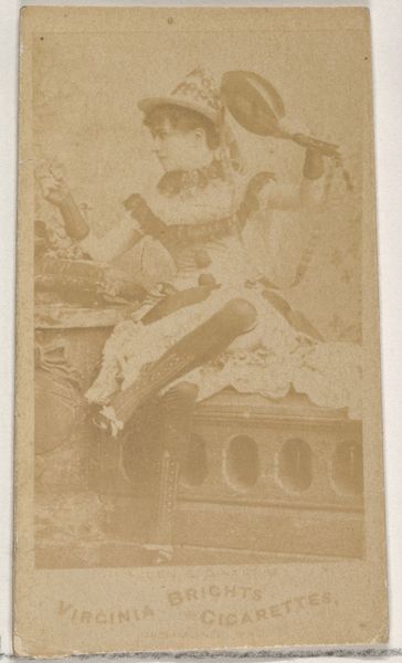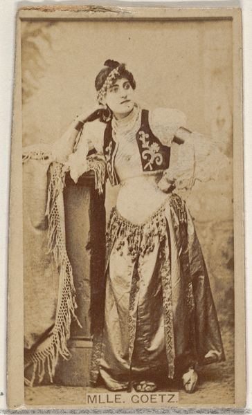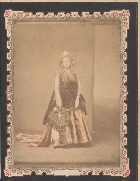 Curator: This photographic image, dating from around 1900 to 1910, is entitled "Zittende vrouw in feestelijke kleding"— "Seated Woman in Festive Clothing." It’s a photomontage attributed to C. Kersten & Co., a publishing house operating in Paramaribo, Suriname. Editor: My first thought? Overwhelming. I mean, she's drowning in jewels and cloth! And there's something melancholy about it, even with all the ornamentation. Like a queen on her day off. Curator: It is compelling. Kersten's firm, we must remember, played a pivotal role in disseminating images of Suriname. They were involved in crafting visual narratives of the colony for European consumption and postcards like this are obviously meant for a broad appeal. The image is a construction and speaks of the social hierarchy. Editor: Right, this isn't just a snapshot. Look at the details – the jewelry isn’t random, nor is her pose, so dignified and straight-backed. All that adornment says wealth and maybe status. Curator: Exactly. The phrase "Koelievrouw" identifies the subject. Post-abolition, indentured laborers from India were brought to Suriname. And she's "in Feestgewaad," emphasizing a constructed presentation. Notice the artificiality: backdrop, carefully arranged pose. Editor: But does the adornment feel like her, or a role she is forced to play? I am drawn in to consider the artist’s point of view. Is this glorification, exploitation, or… something in between? Is this even what a celebration outfit looked like? Curator: We see photography utilized by colonial powers as a tool for defining and controlling perceptions of colonized subjects. Understanding the distribution and reception is just as critical as identifying details. What purpose does a photomontage like this serve, especially if distributed as postcards back to the colonizer's home? What values does it promote or challenge? Editor: So, more than just pretty fabric and jewels, it becomes this little capsule of power dynamics. Curator: Precisely! These images helped reinforce ideas about the exotic other. They created an idea of Suriname which allowed consumers to feel connected while at the same time keeping that distance. Editor: Looking at her again… I am starting to feel sorry for her, knowing what the image may have meant to a different viewer at a different time. All that imposed meaning kind of diminishes her, yet paradoxically it gives her so much power now. Curator: And there lies the complexity of this image and others like it. It reflects the complicated story about colonial power, artistic license, and about agency itself. Editor: I'll definitely not be so quick to judge the melancholic face of queens on their days off in the future! Thanks!