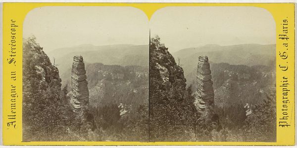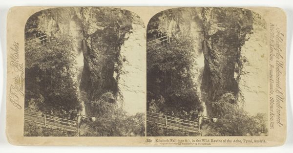 Editor: This is R.M. McIntosh’s "Shady Gorge" from the late 19th century, a photograph presented as a stereoscopic print. The two images side-by-side create an almost uncanny 3D effect. It really emphasizes the sheer scale and depth of the gorge itself, making me feel almost claustrophobic. What stands out to you about the composition of this piece? Curator: Indeed. Observe how McIntosh frames the scene. The verticality of the gorge walls dominates, creating a powerful sense of enclosure. The dark tonality contributes to this feeling, obscuring details and flattening the space. The almost symmetrical placement of the two rock faces further reinforces the structure. Do you notice the limited tonal range? Editor: Yes, it’s mostly grayscale, which makes the texture of the rock more prominent. It seems to simplify the image. Is that typical of landscape photography of the time? Curator: Partially. The absence of color pushes us to engage with form and texture, as well as the quality of light, rather than relying on color to convey the landscape. Look at how the light glances off the rocks creating subtle variations and defining their jagged nature. Consider the print’s surface, too. What might the materiality of photography contribute to the artwork's effect? Editor: I guess the flat surface of the print contrasts the 3D illusion we get with the two combined photographs. The rough textures of the gorge also become flatter than in real life, giving them this stylized pictorial quality. Curator: Precisely. The print, with its smooth surface and monochromatic palette, acts as a mediator between the viewer and the depicted scene. Pictorialism saw the beauty of a composition and the photographic manipulation techniques as an act of artmaking. Have you considered what happens to an idea like "nature" when you consider it being re-presented like this? Editor: That's a really good point. Thanks for making me look at how the artist plays with our expectations in their composition. I never considered that this was an intervention in how we imagine nature as a pure or even 'untouched' subject, when the image is clearly mediated through these techniques. Curator: Of course. By analyzing these qualities we move beyond representation and into the artistic decisions that construct it.