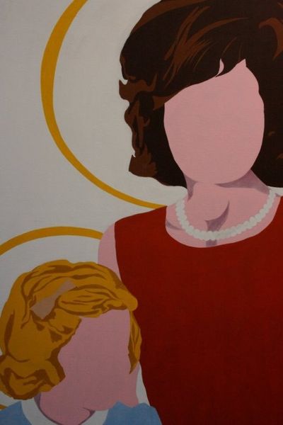 Editor: We're looking at "Little Lamb, I’ll Tell Thee," a 2013 acrylic painting by Zoe Hawk. The uniformity of the figures strikes me, all these girls in matching dresses amidst this unsettling scene. What formal qualities do you see that contribute to the overall mood? Curator: Consider first the interplay between the flattened perspective and the rendering of form. Notice the tension established by the use of bold colors and precise details. How might these contribute to the overall composition? Editor: The red rug and the yellow wall really pop and almost feel stage-like, setting off the blue of the dresses. What about the figure emerging from behind the curtain? The costume and the face are so distinct. Curator: Indeed. Reflect on how that figure functions within the structured organization of shapes and colors. Semiotically, the costume signals to a bygone era. This juxtaposition of elements disrupts the balance. Is the figure’s placement further compressing space? What meanings does this compression convey to the viewer? Editor: The black figure against the white curtain does add a striking vertical element which feels different to the repetition and movement of the girls' figures. Almost an intrusion or imposing. I wonder if the curtain has some purpose for what they are up to? Curator: Good observation! If you break it down you will notice that the organization of space and the strategic use of color generate complexity beyond the depicted scene. It prompts the viewer to ask additional questions. How do you feel that affects our viewing? Editor: Thinking about it now I wonder how much it leaves open to personal interpretation of all of these features to develop our own readings. It seems like the meaning resides in the individual interaction with it. Thank you, that gave me a new way of appreciating form!