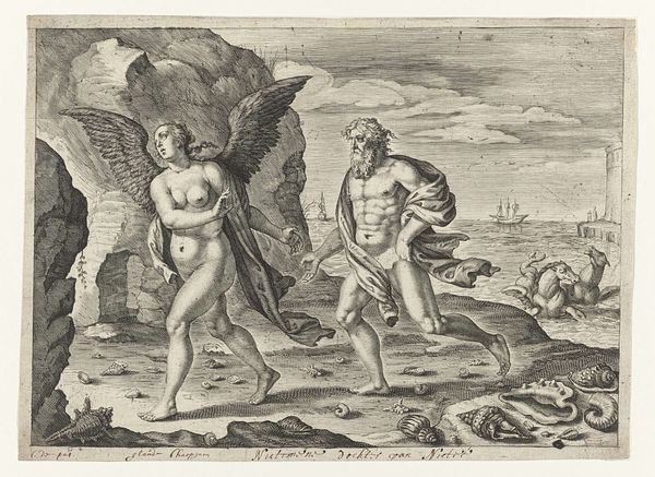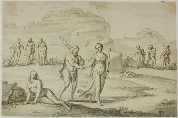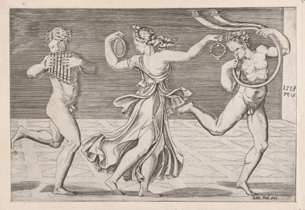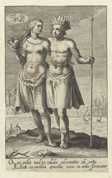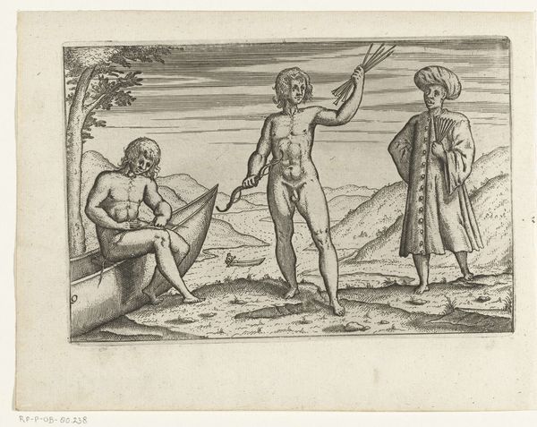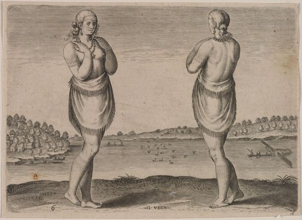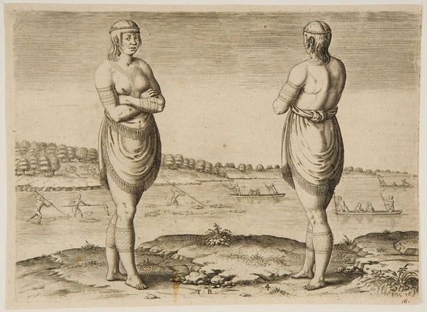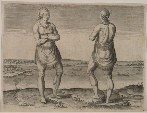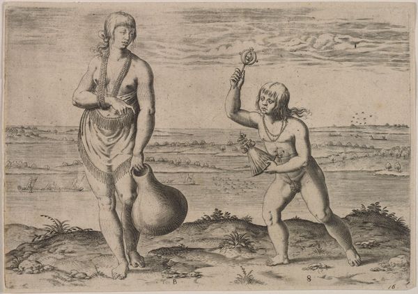 Curator: This is Theodor de Bry’s engraving, "Their Manner of Carrying their Children." Look closely at the fine lines and details. Editor: It feels…staged. The figures are stiff, almost like mannequins in an exotic display. Curator: De Bry never actually visited the Americas. His images were based on others’ accounts, shaping European perceptions of indigenous peoples. Editor: So, this is about the *idea* of indigeneity, filtered through European tools and materials. What did it mean to reduce a culture to a single image? Curator: It served colonial agendas, didn't it? This image reinforces the idea of the "other," justifying European expansion. Editor: I see the labor involved in the engraving, the craft. But it's labor used to perpetuate a fiction, a manufactured image of another culture. Curator: Exactly. De Bry’s work highlights the power of images in shaping historical narratives and justifying power imbalances. Editor: Food for thought. It makes you reconsider the whole role of image-making in the colonial project.