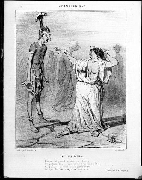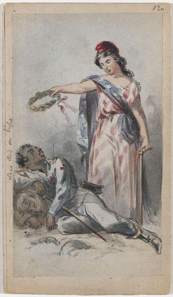 Editor: This small print, "He Died for Me!" by Henry Louis Stephens, depicts a fallen Black soldier and the allegorical figure of Columbia. The lithographic technique gives it a stark, almost propagandistic feel. What can you tell me about it? Curator: Consider the lithography itself. It allowed for mass production, distributing this image widely. The labor involved in its creation and dissemination—the printers, distributors—speaks to a strategic effort. How does the materiality of this print influence its message and reception? Editor: That's fascinating. So, you're saying the *way* it was made is just as important as what it depicts? I hadn't thought about it that way. Curator: Precisely. The context of its production—likely during or shortly after the Civil War—and its intended consumption further shape its meaning. Editor: This has given me a new way to approach art. Thanks!