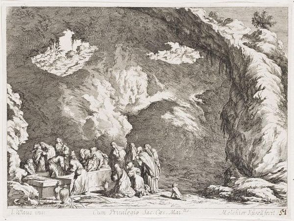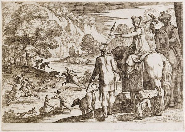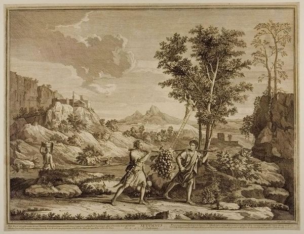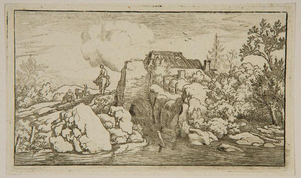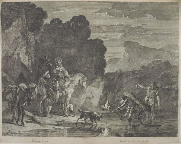 Editor: This etching, "Herd Coming Through a Gate," by Christian Wilhelm Ernst Dietrich, feels almost romantic, like a scene from a pastoral poem. How do we interpret the presence of the animals within this landscape? Curator: The animals represent more than just picturesque scenery. Consider the historical context: land enclosure movements were displacing rural communities, disrupting traditional ways of life. How might this image be seen as a commentary on human-animal relationships within power structures? Editor: So, you're saying it isn't simply a pretty picture, but rather a potential critique of social changes? Curator: Precisely. Dietrich's work invites us to consider who is controlling the movement and resources within this landscape, and at whose expense. Editor: That makes me look at the herder with new eyes! I appreciate the way this highlights the political dimensions within seemingly simple pastoral scenes. Curator: Indeed. It’s a reminder that art is always engaged with the social and political realities of its time.