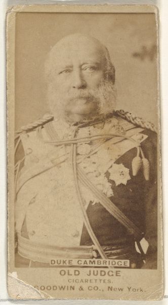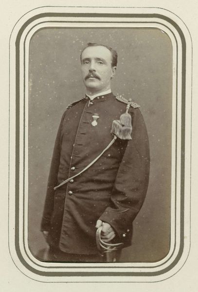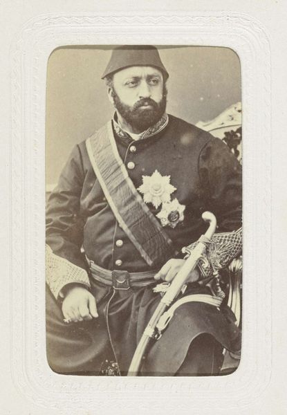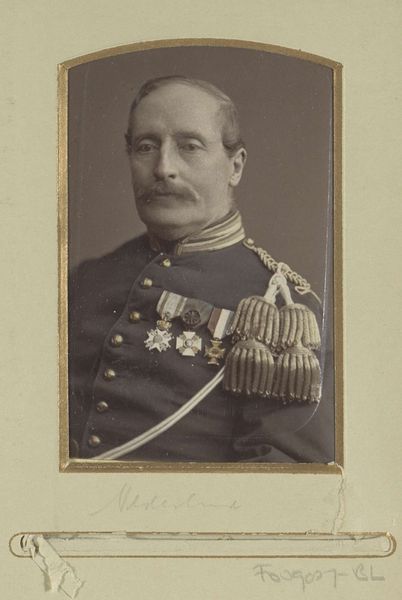 Curator: Immediately, it feels weighty. Like a daguerreotype of power itself, wouldn't you agree? Editor: Indeed. This is "General Giroflor" by Antoine Samuel Adam-Salomon. The image, a photograph at Harvard Art Museums, is a study in the trappings of authority. Look at the column, the medals...it’s all carefully constructed. Curator: I feel his gaze, almost a challenge, through the sepia tones. And I wonder about the sheer volume of wool in that uniform. What stories it could tell! Editor: And the stories of the laborers, too, who wove it! Those details are vital; this image normalizes the social order—clothing production, photography studios, portraiture—it all speaks to an industry built around power. Curator: Perhaps. But I see a man attempting to capture a moment, hoping to be seen in a certain light. Maybe it’s vanity, maybe it’s more. It’s just...human, I think. Editor: It’s easy to forget, isn’t it, the labor and materials inherent in the making of an image. But ultimately, this photograph, like so many of its time, is a record of its own making. Curator: Yes, and in its own strange way, I also find it beautiful.