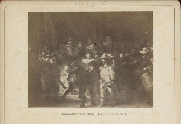 Editor: So, here we have a reproduction of Rembrandt van Rijn's 'The Night Watch,' rendered in pencil and charcoal sometime between 1893 and 1912 by Johan Marinus Schalekamp. What strikes me is how this rendition, even without color, manages to convey the original's dynamic energy. What do you see in this piece? Curator: Beyond just a copy, it is also a reading, right? This work, especially as a reproduction made decades later, prompts questions about power, representation, and the very idea of the "Dutch Golden Age." Consider the historical context: late 19th/early 20th century Europe was obsessed with national identity. So, what does choosing 'The Night Watch' as a subject – a civic guard, symbols of Dutch power – tell us about the artist's or the commissioner's concerns at that time? Editor: That’s fascinating! I hadn’t considered it as anything beyond a copy. Were these civic guards exclusively male? What can that tell us about the dynamics of power at play? Curator: Absolutely. These guards were almost exclusively men, reflecting the social structures and the exclusion of women from positions of power and civic life. Consider, too, the potential for this image to bolster or challenge those very structures, even in reproduction. Is it reinforcing an idealized, masculine version of history, or subtly critiquing it through its reinterpretation? How does Schalekamp treat these figures? Editor: The stark contrast and the close attention to detail feels reverential. Curator: Perhaps, but let's not forget that copies also serve a democratizing function, making art accessible. In its own way, Schalekamp’s work makes Rembrandt and those Dutch values available, if only in trace. Editor: This has totally shifted my perspective. Now I'm thinking about this artwork in a completely new way, as a conversation about history and power. Curator: Exactly. Seeing art as part of a bigger dialogue is how we create more pathways towards an understanding of intersectional narratives, personal identity, and the politics ingrained in everyday life.