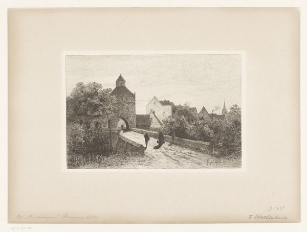 Curator: Immediately I feel a sense of nostalgia, almost melancholic. It’s that hazy, faded black and white that always gets me. Editor: Here we have Willem de Zwart’s etching from 1924, titled "Weiland met boer die een koe melkt"—that's "Pasture with a Farmer Milking a Cow." A perfect snapshot of rural life rendered with the meticulous detail afforded by the etching process. Curator: The landscape itself feels almost swallowed by the trees; it gives the impression of humans and animals just carving a small niche within nature’s overwhelming presence. It really makes me wonder how those early farmers saw themselves within this big picture, don't you think? Editor: I'm particularly struck by the formal composition. De Zwart utilizes light and shadow to great effect. Note the placement of the farmer and the cow almost directly in the center—creating a powerful focal point and balance—which draws your eye right to the heart of the scene: the very act of milking. The detail in the foliage offers an amazing textural depth, particularly considering that the landscape and sky behind are subtly implied. Curator: True. And the etching? It's amazing how it can bring a moment to a screeching halt—allowing you time to actually study things instead of merely glancing over. Editor: Exactly! The choice of etching emphasizes form over hue. De Zwart uses intricate, interwoven lines and minimal hatching. In this technique, it looks at contrasts—dark vs light to define the various shapes. De Zwart captures and highlights their three-dimensional forms. Curator: It certainly takes the "everydayness" of it all and transforms it into something special, even timeless. Like these farming scenes never really change at heart. This image resonates way beyond its time. It tells a small human-and-animal drama—full of tenderness and work ethic. Editor: De Zwart prompts us to slow down, look at the foundational relationships between humanity and our environment. It gives us access to a time where human needs and animal labour lived more synchronously. A scene ripe with complexity if you ask me!
