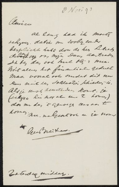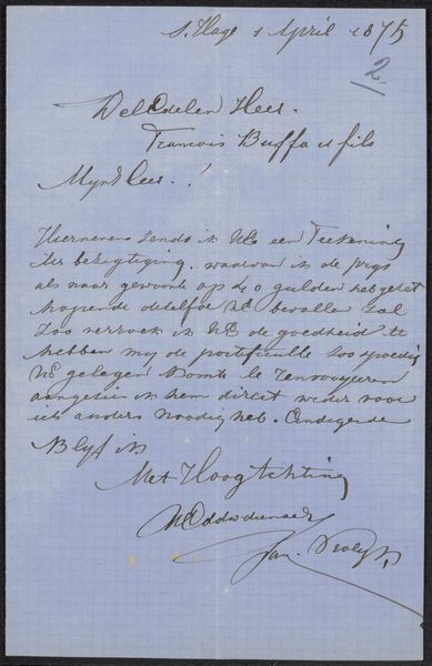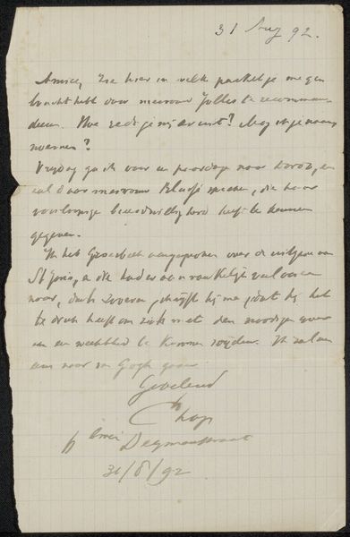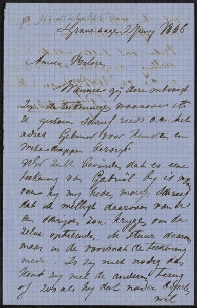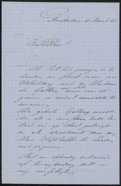 Curator: Here we have "Brief aan anoniem" – "Letter to Anonymous," if you will – likely penned around 1860 by Frits van Gendt, crafted with ink on paper. Something feels incredibly intimate about viewing handwriting like this, don't you think? Editor: It does. The letter, especially because we don't know who it’s addressed to, has an air of mystery, even fragility to it. Given it’s historical, would you describe this as history painting even though it is “simply” a letter? What do you see in this piece? Curator: That’s a fascinating question! While not a painting, its very survival transforms it. I wonder about its purpose: was this letter intended to convey secret information? The grid on the paper, which almost looks like an early digital rendering of the document, only adds to the air of secrecy, and what strikes me is Van Gendt's almost performative flourish in his signature—a final artistic act. What emotions rise when you look at this? Editor: It evokes a sense of longing, of searching for a connection in a time very different from our own. Maybe "history-feeling" rather than painting is more appropriate? The elegant script certainly elevates the note above something mundane, despite its ordinariness. Does the calligraphic element imply some degree of wealth, a leisure allowing dedication to good penmanship? Curator: Intriguing thoughts. I see a certain desperation, a silent plea woven into each stroke. To your query: absolutely. It suggests a particular social standing, or at least a desire to project one. Tell me, what's your final takeaway from our brief conversation? Editor: That even the simplest of personal artifacts can become powerful historical and emotional documents, far exceeding their original purpose. Curator: Precisely. And who knows, perhaps someday, someone will be scrutinizing *our* digital missives with the same wistful curiosity.