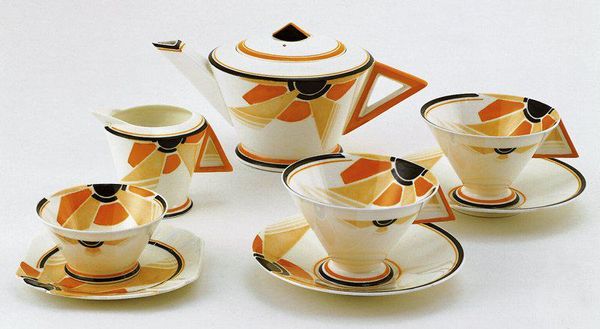 This cup and saucer is part of a tea set designed by Eric Slater. This design reflects the aesthetics of the Art Deco movement, which flourished internationally in the 1920s and 30s. Art Deco was a reaction against the handcrafted and often fussy designs of the earlier Art Nouveau movement. It embraced new technologies, industrial production, and a streamlined, geometric style. Here, the stylized sunburst pattern, the bold color contrasts, and the simplified forms all speak to this new aesthetic. The Art Deco style found its way into many aspects of life, from architecture and furniture to fashion and, as we see here, even tea sets. We can see the influence of social change in this design. Art Deco's emphasis on machine production made beautiful design more accessible to a wider range of people. Historians of design might look at trade publications, manufacturers' catalogs, and period advertisements to understand how Art Deco transformed everyday life.