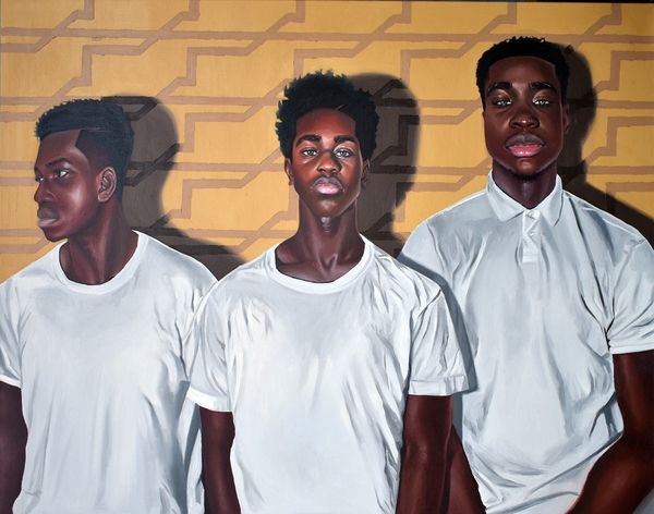 Curator: Monica Ikegwu created this artwork entitled, "Money on the Mind," in 2017. What's your initial reaction? Editor: It’s striking. There's such a contrast between the two figures – one consumed by digital information, the other physically grasping wealth. It feels like a commentary on modern priorities. I am drawn to the details of the clothing; those shades and folds! What materials did she use to render them so masterfully? Curator: Knowing Ikegwu's background, it’s hard not to see it as a statement on access and labor in the digital age. The girl, with what appears to be a cardiogram on her phone, might be representative of our obsession with social media. While the figure counting cash reflects capital gain at any cost. The visual representation may indicate a reliance on certain technologies while the labor could speak of those less inclined to do so, leading to unequal access. Editor: Access is the key. And I wonder what materials and methods informed that vision. It would be revealing to learn more about her technical approaches. Looking closer, the execution makes it seem very painterly; almost as if traditional portraiture clashes with modern digital dependency. What social discourse on value does Ikegwu evoke using those portraits, the money, and the smartphone? Curator: It raises questions about the structures that perpetuate these inequalities, no doubt. It critiques the systems, policies, and beliefs that allow some to accumulate wealth, like the man in the portrait, while others are caught in the grind of contemporary times or are relegated to consumerism by holding their ever present and often times overused smartphones. I find it poignant how she's capturing a particular tension within a very specific socio-economic bracket in contemporary society. The portraits are meant to serve as a modern warning. Editor: A warning echoed in the texture of the paint itself! Knowing her chosen process deepens that connection; how does it add another layer of meaning, highlighting the art of producing or not producing? Curator: Definitely food for thought on the societal impact. Editor: Yes, I leave more curious about the implications and intent than before, thanks.