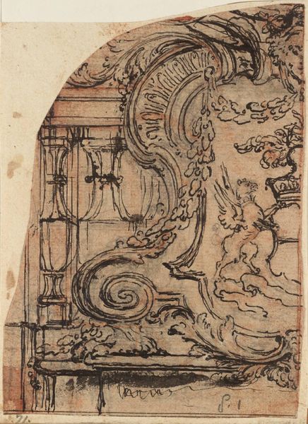 This fragment of an architectural frame was drawn anonymously, using pen and watercolor. Note the Corinthian column, an echo of classical antiquity, and a symbol of sophistication and order. The volutes—those spiraling scrolls—carry with them a sense of dynamic movement. We can see how similar motifs reappear throughout history; consider the volutes on an ancient Greek Ionic capital, full of life force. These forms evoke something deep within us. The image becomes a site where our collective memory resides, where echoes of past aesthetics resonate with our present sensibilities. Even the grotesque face peeking out reminds us of the gargoyles of Gothic cathedrals, acting as protectors, warding off evil. These symbols are far from static; they are in constant dialogue, their meanings shifting and layering with time. This image engages us on a primal level, tapping into the wellspring of human emotion and leaving us with a profound sense of connection.