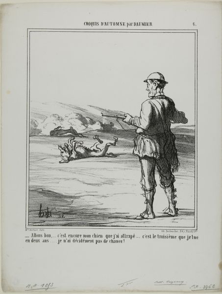 Curator: This is Honoré Daumier's "The Hunter Hunted," a work that captures a rather undignified retreat. The composition uses a circular vignette to focus the action. Editor: My first impression is one of chaotic energy; the diagonal lines create a sense of urgent flight. Curator: Daumier was a master of social satire, often skewering the bourgeoisie. Notice the hunter's frantic expression—hardly the picture of bravery. Editor: The stark contrast between light and shadow amplifies the drama. The rough, sketch-like quality adds to the sense of immediacy. Curator: Consider the political climate of 19th-century France, where the aristocracy's power was waning. This piece likely reflects public sentiment toward the privileged. Editor: Yes, the composition traps the main figure, highlighting his vulnerability within a system he thought he controlled. Curator: Indeed. This image reminds us of the complexities inherent in social hierarchies, even those seemingly immutable. Editor: And that masterful use of line really pulls the eye straight into the heart of the story. I appreciate the immediacy in that artistic decision.