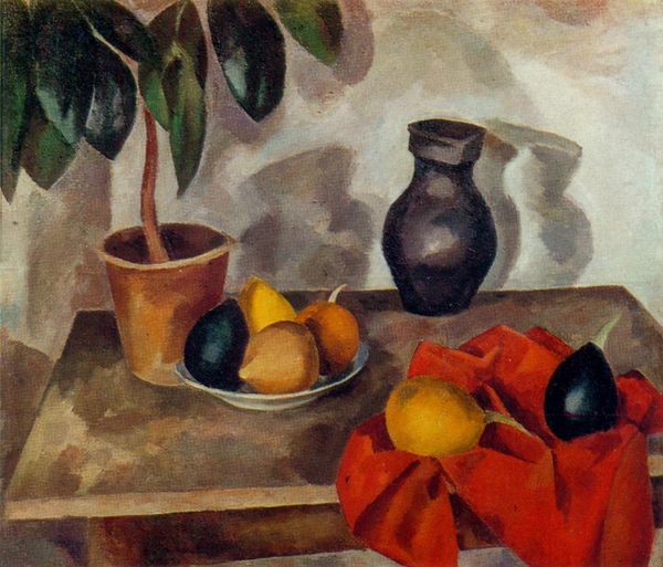 Editor: This is "Flowers in a Grey Jar" by Pablo Picasso, created in 1908, using oil paint. It feels so simple and still, almost melancholic. What can you tell me about it? Curator: Well, first, look at how Picasso is arranging space. The tabletop is fractured; the jar is simplified to almost geometric forms. Notice that even the flowers themselves seem to struggle to escape the flatness of the canvas. What emotional undertones might spring from that sense of being constrained? Editor: I hadn't really noticed how the shapes fight each other. It does add to the still, almost frozen, feeling of the work. Curator: Exactly! These are not simply flowers in a jar; the very concept of stillness and domesticity is being questioned. What associations do flowers carry across cultures? Life, beauty, fragility... and here, Picasso seems to almost trap them, pushing against those traditional associations. It hints at a sense of unease that reflects a wider shift that was underway in the early 20th century. Editor: So the jarring shapes mirror that social shift. What about the color palette? It seems subdued. Curator: It is. The muted grays, browns, and greens lend to that feeling of something being suppressed, almost held back. Do you notice any hints of hope, of life breaking through? Editor: Maybe the orange flower near the top right? It feels like a small spark against all the muted tones. Curator: Precisely. Even in restraint, Picasso can't quite extinguish the symbols of beauty. And it is that very tension that makes it powerful. It encapsulates cultural anxiety during the period that simultaneously held on to beauty, yet looked to move past traditional norms. Editor: It’s so interesting to consider the flower as a cultural symbol. Thanks, I have something new to think about!