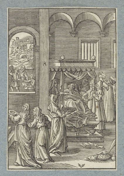 Editor: We are looking at "Door de rozenkrans worden duivels ontmaskerd", an engraving made around 1610 by Theodoor Galle. It's at the Rijksmuseum. The detail in this small print is incredible. I’m struck by the composition; it feels staged, like a play frozen in time. What elements stand out to you, and how do they guide our understanding? Curator: The composition is indeed deliberate, reflective of Baroque aesthetics where visual impact is paramount. Observe the strong diagonal lines directing the eye across the picture plane, and the layering of figures creating depth and visual drama. The distribution of light and shadow contributes significantly to this dramatic effect. Editor: Yes, the light really focuses the attention. Can you elaborate on that? Curator: Absolutely. Galle has manipulated light and shadow—chiaroscuro, to use the formal term—to emphasize the central figures. This highlights the narrative elements: the ‘obstinate sinner’ being confronted and, above, the spiritual consequences implied. The stark contrast lends an air of drama and moral weight to the piece. Notice too how texture is rendered by the different applications of line, from fine and dense in shadow, to sparse in highlights. Editor: That makes sense. Looking closely at those finer details definitely adds a layer. I guess I was focusing on the overall scene. Curator: The strength of Formalism lies in this ability to extract layers of meaning through sustained visual engagement, rather than immediately reaching for symbolic or historical contextualizations. Do you find that your appreciation of the engraving has shifted with this focused examination? Editor: I do. Now I am thinking of all those different points of view—it has enriched the work so much. Thanks for opening my eyes.