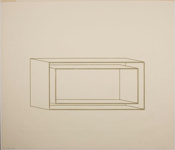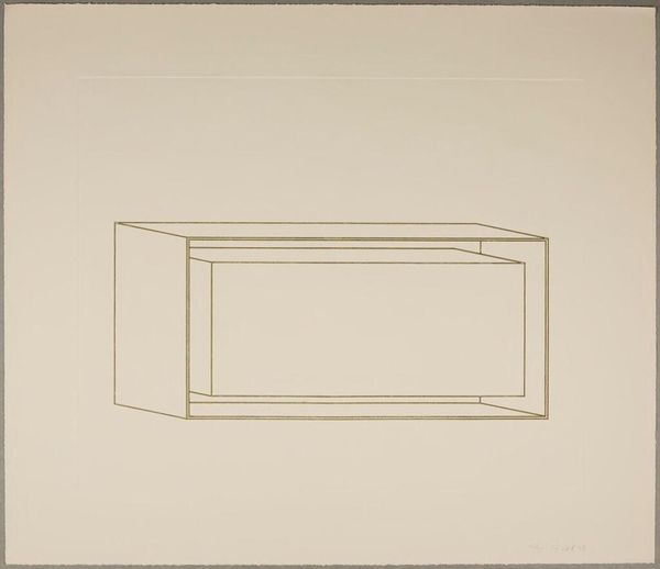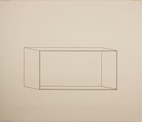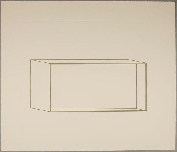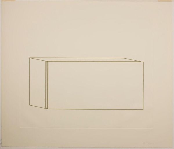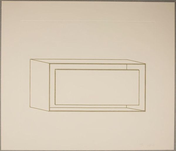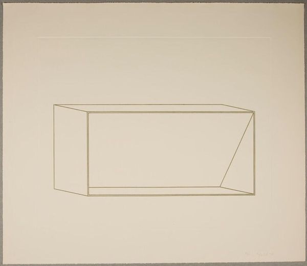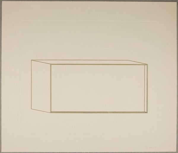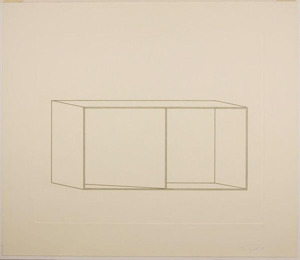 Editor: This is Donald Judd’s "Untitled," from the Harvard Art Museums. It’s a simple line drawing of what looks like a box. It feels very stark. How do you interpret this work? Curator: I see Judd using geometric abstraction to question the very nature of art objects within capitalist structures. How does its lack of ornamentation challenge traditional notions of artistic skill and value, particularly in relation to labor? Editor: I hadn't thought about it like that. It makes me wonder, what is Judd trying to say about mass production? Curator: Exactly! Consider how Minimalism, with its industrial materials, disrupts the art market’s emphasis on unique, handcrafted pieces. What does that signify for you? Editor: It’s like he is stripping everything down to the bare essentials. Curator: It's a radical gesture, isn’t it? Now how does it intersect with post-war socio-political realities? Editor: It feels like a rejection of established norms. I never would have seen that in this simple drawing! Curator: That's the power of art, isn't it? It makes us question everything.