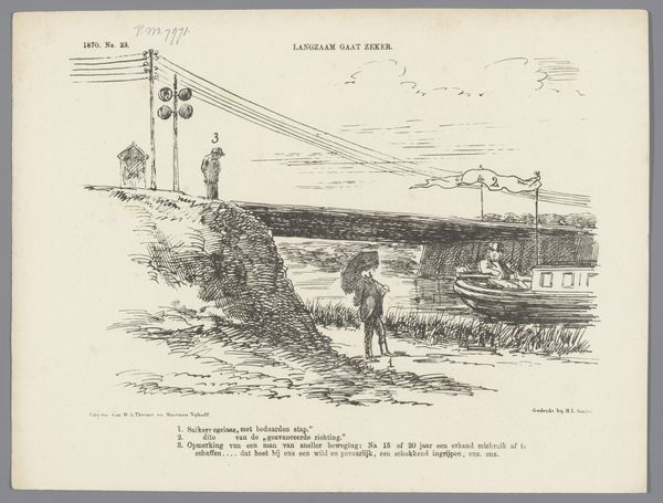 Editor: This engraving from 1882 by Johan Michaël Schmidt Crans is titled "Het Schip van Staat" or "The Ship of State". It's a very detailed drawing of a ship, and two tiny men appear to be struggling to keep it afloat. It strikes me as… satirical. What is your interpretation? Curator: Yes, satirical is a great way to describe it. Caricature is a fine art. You see this dilapidated ship looming, with those men literally propping it up with planks labelled “Colonies” and “Foreign Affairs”. It screams political commentary. A visual representation of a government, perhaps Netherlands itself, struggling to stay afloat, burdened by its colonial ambitions and foreign policies. I wonder, were you able to glean that the plank with colonies had "Buiten" written on it. "Buiten" means "outside" and refers to "external affairs". So many things going on in just one picture... Did you have other reactions to this? Editor: Absolutely! I noticed those labels. What is most impactful, I think, is just how tiny the figures are compared to the size of the boat! It suggests the monumental weight on the common man. Curator: Precisely. The scale is exaggerated for emphasis. It’s this David-and-Goliath power dynamic, except perhaps David is too tired to even bother aiming his sling. A really tired David, should I say! Did the title resonate with you? I wonder, could this be applicable across all democratic nations even today? Editor: That's a great point! And to be honest, now I notice so much more with the ship itself. It seems ready to buckle under pressure. This has changed how I interpret it, seeing the larger scope and how it comments on society. Thank you for offering your insights. Curator: And thank you, your observation about the scale gave me a fresh view of the people's relationship to power. A thought provoking picture it is.