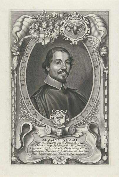Curator: This is a 1648 engraving by Paulus Pontius, currently held at the Rijksmuseum. It's a portrait of the diplomat Philippe Le Roy. Editor: My first impression is that it’s incredibly detailed! There’s an almost oppressive weight to the frame around his face. Curator: Note the intricate oval frame; it bears the inscription "Regnare est servire Deo" – "To reign is to serve God." Structurally, it reinforces a visual hierarchy, centering Le Roy as the subject but also subjecting him to divine will. Editor: The heraldry at the top corners speaks volumes, doesn't it? Those coats of arms and the cherubic figure directly above Le Roy project a complex network of allegiances—family, state, and spiritual authority, all converging. The cherub introduces an interesting duality—mortal governance and heavenly mandate. Curator: Precisely! Consider the sharp, linear quality of the engraving. It uses stark contrast to create volume and depth. Pontius masterfully uses the medium to convey texture, from the fine hairs of Le Roy’s moustache to the heavy folds of his robe. Editor: And what about Le Roy’s chain and the figures flanking the crest at the bottom? They feel less about personal adornment and more about broadcasting affiliation and societal role. The entire piece almost serves as a symbolic resume—his accomplishments rendered visually. Curator: His gaze is critical to the overall composition. Le Roy is looking directly at the viewer. It suggests an intentional presentation of himself—carefully constructed and undoubtedly controlled. The clarity of line and precise hatching underscore this deliberate attempt to create a lasting image of power. Editor: Thinking about it all, this portrait acts as more than just a likeness. It's a study in the symbols of power and obligation. Curator: A sophisticated blend of Baroque aesthetics and political iconography—Pontius gives us much to consider through his keen manipulations of form. Editor: Indeed. It has changed my view of 17th-century portraiture.