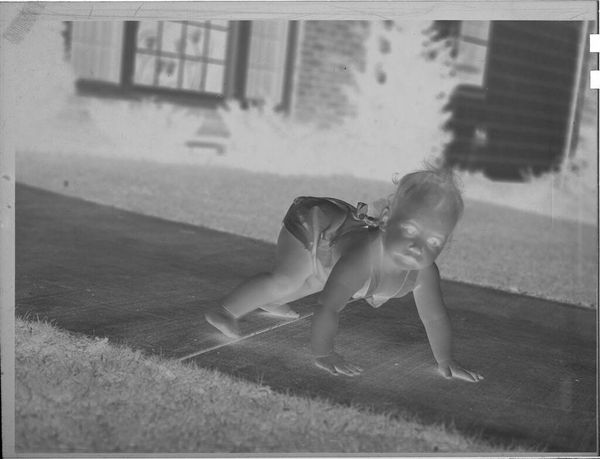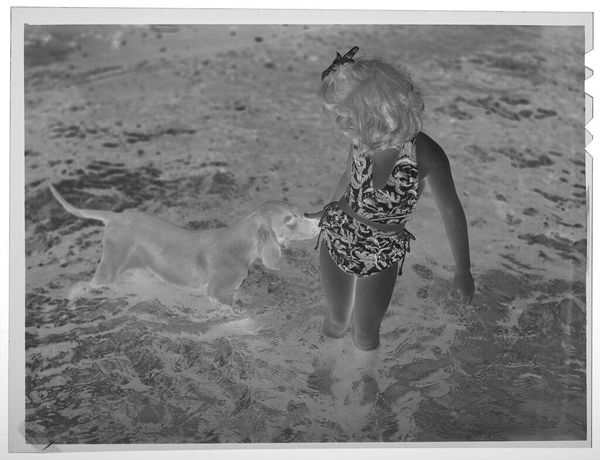 Editor: This small, undated photograph by Lucian and Mary Brown, titled *Untitled (little boy on beach in water)*, has this almost ethereal quality because of the negative image. What symbols or deeper meanings do you find here? Curator: The inversion itself is powerful. Water is often a symbol of cleansing, rebirth, and the unconscious. Inverting the image can represent something hidden or revealed – perhaps a questioning of innocence, a memory yet to be fully formed. Does it evoke a sense of nostalgia? Editor: Definitely, a poignant reflection on childhood and memory. Curator: The beach too, a liminal space between land and sea, symbolizes transition and the fluidity of identity. Perhaps the child's interaction with the water is a symbolic exploration of self. Thank you for your perspective.