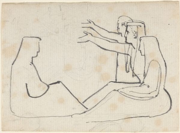 Curator: Mark Rothko’s untitled pencil drawing features loosely defined forms clustered within a rectangle. The rest of the page is bare, save for some faint impressions, perhaps another sketch interrupted. What are your first thoughts? Editor: Sparse and searching. The tentative quality, emphasized by all that negative space, gives it an air of both fragility and potential. I immediately focus on that defined rectangular space, in stark contrast to the wispy forms within. Curator: Yes, Rothko seems to be working through something, experimenting with spatial relationships. Note the drawing medium—simple pencil on what appears to be notebook paper. This isn’t a grand statement in oil paint but a study, an intimate record of artistic labor. It democratizes the creative process. Editor: The figures—do you see figures, too?—are incredibly evocative. The simplified shapes suggest primal, almost totemic imagery. The arrangement reminds me of the alignment of celestial bodies or figures frozen in a ritual. Those rounded forms, combined with angular elements... they feel heavily symbolic. Curator: Symbolic how? I’m interested in what isn’t explicitly represented—the blank space, the unfinished quality, and what that tells us about the context of art making. Rothko used rudimentary materials to contemplate form. The method allowed for immediate response and simple modification of the image. Editor: It is clearly unfinished, a process captured mid-stream. And those crude materials amplify the raw emotive power of the piece for me. I keep coming back to that sense of something ancient being re-articulated in a modern idiom—a continuous thread of cultural memory. Look closely, for example, at the zigzags that create implied faces and figures; there's clearly an impulse at work here. Curator: I suppose, viewing art is in and of itself a method for imbuing artwork with culturally influenced context. Thank you, your points add additional layers to consider in viewing this piece. Editor: Indeed, by drawing it out into a collaborative setting, we highlight its nuances and further establish and interrogate meaning.