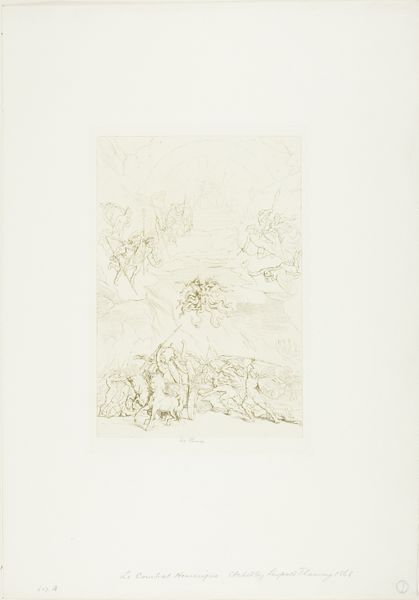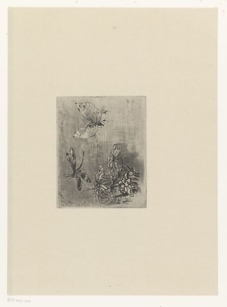 Curator: Looking at this ethereal etching from the 1870s, titled "Illustration til Holger Drachmann, 'Aarstiderne'. Maj," one is immediately struck by its delicate beauty. It's thought to be the work of an anonymous artist, brought to life using drawing and print media. What are your initial impressions? Editor: It feels remarkably dense for a landscape, almost claustrophobic. The use of line is interesting—a whirlwind of activity contained within the picture plane. The contrasting dark and light regions draw you in but provide few visual clues of what the exact dimensions or structure might be, apart from suggestive indications of dense foliage. Curator: Exactly! Consider this was created in a time of immense social upheaval, witnessing industrialization and burgeoning social movements. I feel the artist's choice to depict a lush, perhaps untamed, natural space offers a counter narrative to that world. Think of the Romantic period that was just beginning to blossom in other forms of artwork at the time. Editor: I see your point. Yet, look at how the dense network of lines interacts. The forms appear somewhat indeterminate as the structural organization is suppressed through a certain blending and diffusion of lines in the overall visual experience of looking at the work. We might regard this etching as less a symbol of untamed nature, but, in contrast, an almost artificial construct given these competing visual cues. Curator: Interesting! Another approach could be considering what May signifies—new beginnings, fertility, a return of vibrancy after winter. In the Nordic context particularly, where winter grips for so long, May held, and perhaps continues to hold, immense cultural weight. Perhaps this artist uses the density to convey that explosion of life after the bleakness. Editor: Perhaps the artist worked spontaneously to build forms as a matter of improvisation where the end visual configuration resulted without the use of visual structural cues. The medium may have lent itself to this particular overall organization, if at all intentional as the debate evolves on questions surrounding artistic intention, authority, and the final interpretation that emerges from the viewer. Curator: Ultimately, I think we can agree on the evocative nature of this seemingly simple work. It’s small, understated but asks profound questions about humanity and the world we inhabit. Editor: Agreed. Its formal tensions and complex simplicity provide many interesting and different avenues to analyze it as a work of art.