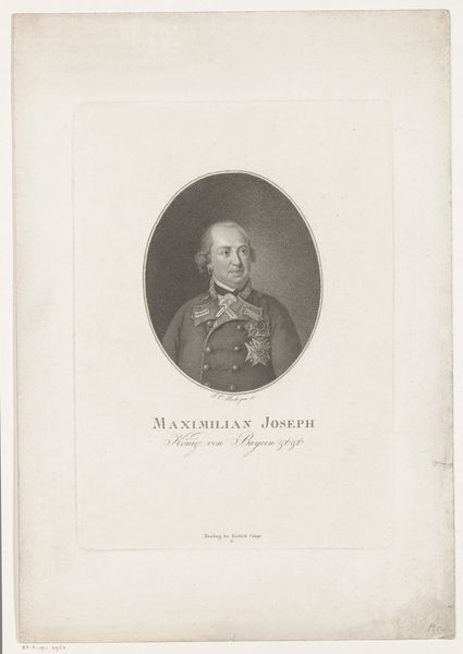 Curator: This is a lithograph by David Monies, dating back to 1833. It depicts Overhofmarskal A.W. von Hauch, and currently resides in the collection of the SMK, the Statens Museum for Kunst. Editor: He certainly looks…imposing. Stern. There's a rigidness to his posture, and the sharp contrasts in the lithography only amplify that sense of formality. Curator: Monies worked extensively as a portraitist. As Overhofmarskal, von Hauch occupied a high-ranking position within the Danish Royal Court, reflected in the regalia he wears. Prints like these served as vital visual representations of power and status in the early 19th century. They were tools of social communication. Editor: I'm struck by how the artist captures the textures—the velvet of his coat, the intricate weave of his sash, the subtle gradations of his skin. Lithography seems particularly well-suited to render these nuances, and the effect is almost photographic, imbuing this image with a sense of “realness." Yet it does raise questions about who is memorialized in such works. Who gets their story told and celebrated? Curator: Precisely. It's essential to acknowledge the historical context. Portraiture, especially printed portraits, served a specific function within a hierarchical society. This image was commissioned by and circulated among a particular elite. While offering incredible insights into the appearance and social standing of figures like von Hauch, it implicitly excluded a vast segment of the population. Editor: Looking at his face, I wonder what stories it holds. The tight-lipped expression hides as much as it reveals, but he bears an unwavering determination. Curator: Indeed, perhaps it is that tension, the balance between what is shown and what is withheld, that makes this print so compelling. It presents us with an opportunity to consider not only the life of one man, but also the structures that shaped his world. Editor: It's fascinating how this portrait captures an individual while simultaneously reminding us of the systems that defined his identity and position within society. A powerful commentary on representation and power.