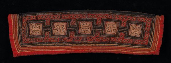 Curator: Looking at this Fragment, a weaving likely created between 1000 and 1532, I immediately think about the complex cultural exchange and colonial impact in the Indigenous Americas. Editor: My initial response is awe at the texture. It looks carefully made. You can feel the weaver’s labor in its intricate, geometric patterns against that beautiful, muted brick-red ground. Curator: The geometry itself is fascinating, a visual language indicative of deep cosmologies and social structures. It speaks volumes about identity in Ica. These textiles were more than decoration. They served as markers of status, narrators of history, and sacred objects within intricate social systems. Editor: Absolutely. We need to consider how this fragment’s materiality relates to power dynamics within Ica society. Who controlled the means of textile production, and what significance did specific dyes and fibers carry? This weaving shows sophistication with dyed fibers woven into rectilinear shapes against a solid colored background. Curator: Exactly. Textile production, access to resources like dyes, the geometric and the iconography depicted--all contribute to our understanding of the sociopolitical landscape. How did gender roles intersect with weaving? How did colonial dynamics disrupt those traditions, revaluing some materials while erasing others? Editor: It also provokes a curiosity about the lives and materials intertwined in its creation. The weaver's skill represents hours dedicated to labor. From where were the textile’s raw materials gathered, processed, and distributed, and what does this suggest about Ica’s exchange networks? Curator: When considering Indigenous Americas art from this period, we must be mindful of the fragmented narratives often presented. It is important to seek alternative epistemologies when understanding this object. Editor: True. While museums provide important points of access to objects like these, considering them outside a western exhibition context can alter the narrative about the role this played as a valued good in trade networks. Curator: So, as we look at this small, surviving "Fragment", may we acknowledge the profound interconnectedness woven into every thread. Editor: And appreciate the material intelligence it reveals about resourcefulness and adaptation.