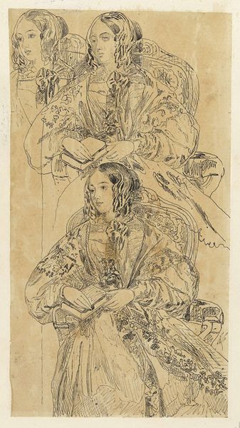 Editor: This is Rodolphe Bresdin's "Two Women with Elaborate Headdress and Hair," housed here at Harvard Art Museums. I'm immediately drawn to the contrast between the detailed linework of the woman on the left and the more ethereal rendering of the figure beside her. What catches your eye about the composition? Curator: The composition is indeed striking. Bresdin’s use of line—dense and almost frenetic in the primary figure, then sparse and suggestive for the secondary—creates a dynamic tension. Note how the headdress becomes a focal point, directing our gaze upwards, elongating the visual field. How does the scale influence your perception? Editor: Given its diminutive size, I find the level of detail incredible. It feels almost like a captured moment, a fleeting glimpse into a different era. Curator: Precisely. The intimacy of the scale amplifies the intensity of the line work, elevating what could be a simple sketch into a compelling study of form and texture. I wonder, does this contrast in rendering techniques suggest varied emotional states of the two figures? Editor: That's a fascinating perspective! I hadn't considered the emotional dimension implied by the line work. Thanks for pointing that out. Curator: My pleasure. Close observation unlocks a wealth of meaning.