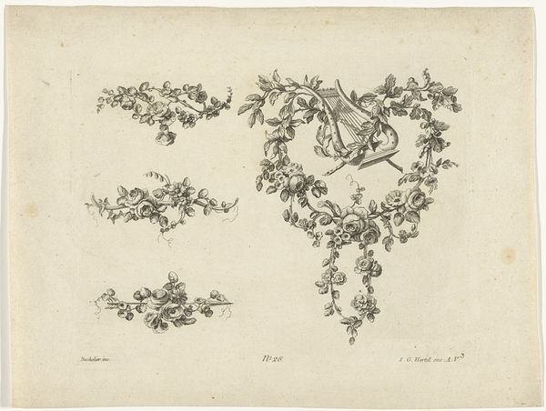 This is Peter Paul Bouché’s ‘Design for a Signboard’, an etching. The ornamental design features an abundance of intertwining grape vines which radiate movement, with the eye drawn to the blank central escutcheon. The composition is dominated by these winding grapevines laden with fruit, with the organic forms and flowing lines creating a sense of exuberant growth and fertility. This visual language speaks to the broader cultural associations between wine, celebration, and abundance during the Baroque period. Note how cherubic figures are embedded within the foliage. These additions soften the architecture and add a semiotic layer which links to classical mythology and the celebration of nature. The formal design destabilizes the rigid structures often associated with architectural drawings. The design embraces organic forms, and suggests a tension between natural motifs and human-made structures. The cultural and philosophical underpinnings, therefore, lie in the desire to integrate the natural world into the constructed environment.