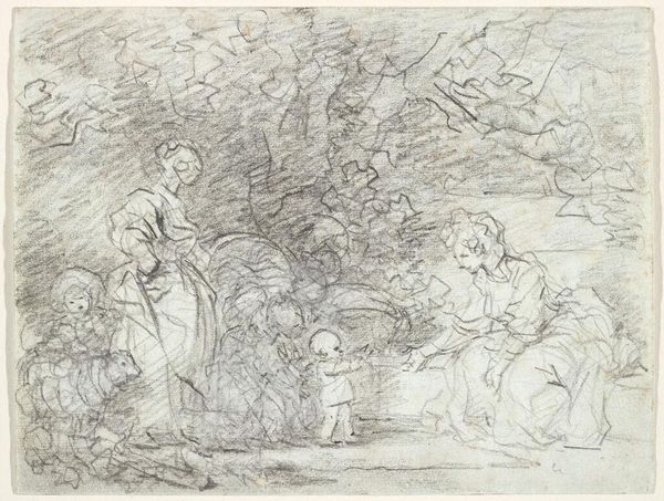 Rembrandt van Rijn created this lightly etched piece, "The rest on the flight to Egypt," capturing a biblical scene through the lens of 17th-century Dutch sensibilities. The artwork portrays Mary, Joseph, and the infant Jesus during their flight into Egypt, seeking refuge from Herod's infanticide. Rembrandt, deeply engaged with humanistic themes, presents a tender, intimate moment amidst displacement. Mary's posture holding her child reflects not only maternal care, but also the vulnerability inherent to the refugee experience. Joseph, weathered and watchful, embodies the protective figure navigating uncertain terrains. Consider the historical context: the Netherlands, a haven for various religious refugees. Rembrandt’s choice to depict the Holy Family as weary travelers resonates with the experiences of those seeking asylum, highlighting the universal quest for safety and the shared humanity between biblical narratives and contemporary realities. The delicate etching lines add to the emotional weight, inviting empathy and contemplation on themes of displacement and protection.