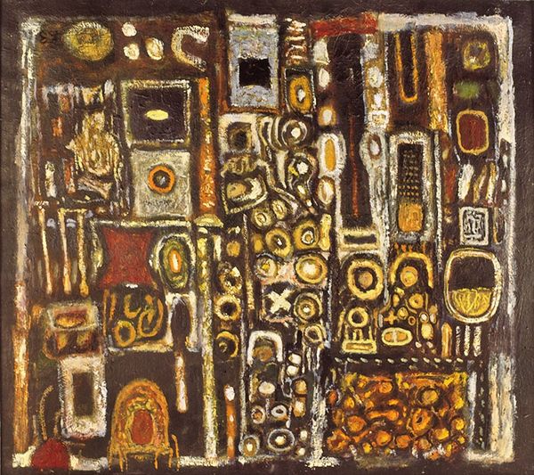 Editor: We’re looking at “The Magnificent,” an oil painting by Richard Pousette-Dart, created in 1951. It feels very layered and almost frantic in its energy. There's so much to visually unpack, where do you even begin with a work like this? What strikes you most? Curator: Initially, I'm drawn to the structure—the linear scaffolding that contains the energetic brushstrokes. Notice how the artist employs these vertical lines to organize the chaos, almost like a musical staff for visual notes. Observe the interplay between line and form, the tension it creates. Do you perceive a hierarchy of colors or shapes within this framework? Editor: I see what you mean. The red is definitely dominant, creating these vertical bands. And those contained shapes do remind me of musical notation, or even glyphs in a language I can’t quite understand. So the lines create structure from that chaos? Curator: Precisely. Consider how the artist uses varying thicknesses and opacities in those black lines. They aren't merely boundaries but active participants in the composition, guiding the eye and adding depth. And let’s think of it as a symphony. Does the color palette suggest a certain emotional tonality, perhaps an attempt to depict complex psychological states? Editor: The bold colors give it an almost primal feeling, like raw emotion. So, instead of pure chaos, it’s organized chaos…like a vibrant system or score. Curator: Precisely. Pousette-Dart uses that control in conjunction with apparent randomness. We are perceiving not only emotion, but perhaps control over the expression of that emotion. Editor: It’s almost as if it were trying to express a sense of structured spontaneity. It’s far more intentional than I initially perceived. Curator: Agreed. What appeared to be a chaotic outburst, on deeper viewing and thought, is anything but. The balance between form and freedom yields much, upon reflection.