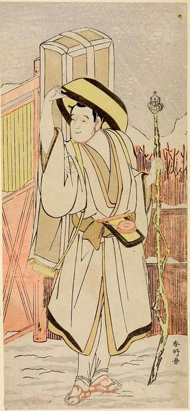Editor: This print by Katsukawa Shunko, titled "Actor Ichikawa Yaozo," feels so charged with emotion. What strikes me most is the tension in the figure’s pose. How do you interpret this work? Curator: The actor's posture speaks volumes, doesn't it? The sword, the twisted body – they evoke a sense of conflict, perhaps even betrayal. It’s interesting how ShunkÅ uses these visual symbols to tap into universal themes of struggle and resilience familiar to the audience. Editor: So, it is like the artist uses symbols to tell a complex story about human experience? Curator: Precisely! These aren't just aesthetic choices; they're cultural signifiers loaded with meaning. By studying these recurring symbols, we can understand collective emotions over time. Editor: I've learned a lot about decoding visual cues. Curator: And I am reminded of the enduring power of images to communicate across generations.