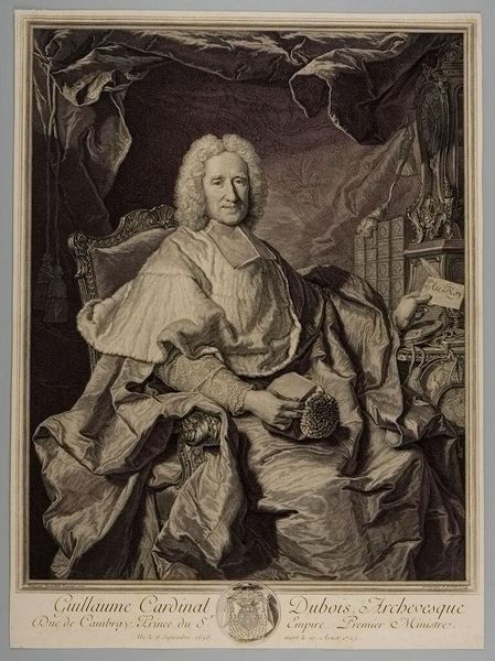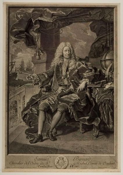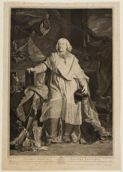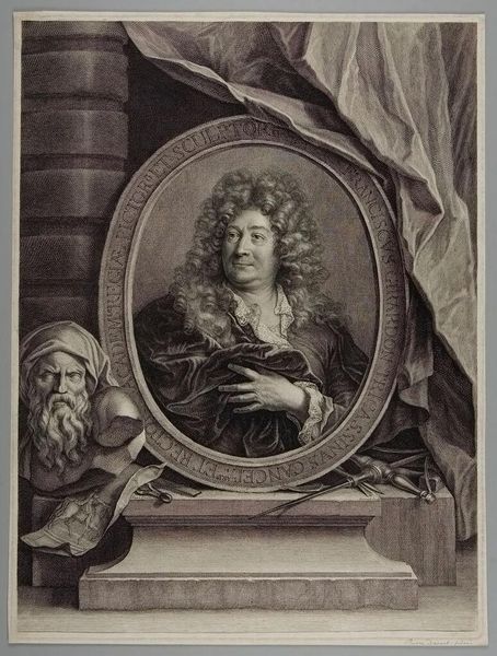 Curator: Let's turn our attention to this striking engraving by Pierre Drevet, depicting François Louis de Bourbon, Prince de Conti. Editor: Oh, the Prince practically shimmers! Look at that pose, so self-assured. It’s like he’s daring us to question his power. Curator: Drevet, born in 1663, was a master of the burin, and the level of detail he achieves here speaks to a deep understanding of the printing process and its relationship to social status. The work exists as both an aesthetic object and a document of power. Editor: You know, I find it strangely intimate despite the grandeur. It is as though he is trying to tell me a story. Curator: Indeed, and that story involves not only the Prince himself but the very means by which his image was disseminated and consumed. Editor: It is quite haunting, I must say. Curator: For sure, the Prince and the engraver managed to capture a fleeting moment in time with such precision.
