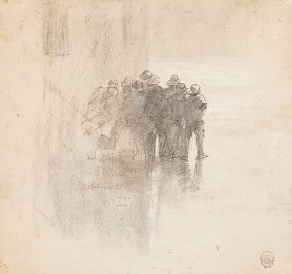 Curator: This is Luc-Olivier Merson's "Girard de Roussillon et sa femme Berthe", rendered in charcoal and pencil. It's a striking piece, wouldn't you agree? Editor: Yes, a very somber and austere piece. The composition feels enclosed, almost claustrophobic, reflecting perhaps the couple’s hardship, wouldn't you say? There is definitely a feeling of sadness there. Curator: The artwork offers us an insight into representations of work, especially physical labor. See how the man toils with a shovel? We can consider it as an indication of labor practices from the period, focusing our attention on the material conditions of life depicted and their implications on this couple. Editor: Exactly. And considering that Girard and Berthe are figures from medieval romance, Merson might be subtly commenting on the displacement and dispossession that often plague marginalized people. He uses his visual storytelling to explore ideas around societal structure, resistance, and even gendered expectations. Note that the wife seems more relaxed at home while the husband performs physical labor. Curator: True. The very process of charcoal drawing - grinding, mixing, applying - mirrors the act of constructing and deconstructing these power dynamics you speak of, where the narrative can be 'rubbed' and shaped differently. Furthermore, the visible application of labor contributes to the authenticity of the landscape in this work. Editor: It also gives me the sense that these characters find themselves trapped in their narrative, struggling with circumstances out of their control. Berthe has her hand up as though indicating she cannot do any more. Their roles feel predestined by something outside themselves, perhaps, the romance epic the drawing represents. Curator: Indeed. By observing these methods, we're encouraged to interpret not just the narrative, but how it aligns to the broader artistic movements and social ideologies of the time of its making. Editor: I see this art reminding me of how stories of ordinary people contain seeds of wider cultural anxieties about displacement, labour, and freedom. Curator: It certainly gives a lens to understand the way Merson understood class differences. Editor: I am sure audiences can appreciate it too.