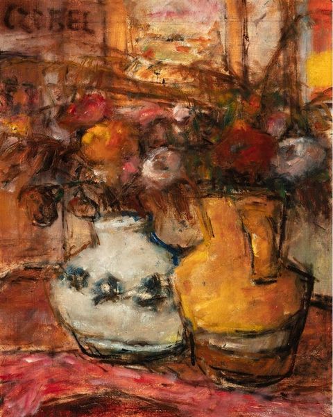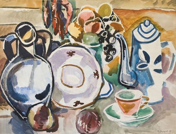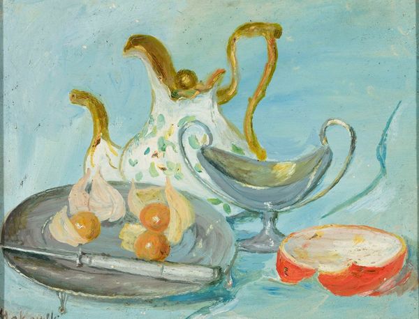 Editor: So this is Émilie Charmy’s "Still Life" from 1904, rendered in oil paint. The vibrant colors give it an almost unsettling energy, contrasting with the traditional subject matter of a still life. How do you interpret this piece? Curator: The dissonance is fascinating, isn’t it? While Charmy engages with the familiar subject of a still life, she does so through the Fauvist lens. This carries a symbolic weight. Still lifes, historically, represent the transient nature of life, “vanitas.” The Fauvist colors, however, inject an almost aggressive vitality, questioning mortality itself. Do you see how the palette shifts the reading? Editor: I do. It feels less about acceptance of death and more about...a rebellion against it? The bold greens and reds seem to fight against fading away. Curator: Precisely. The colors clash but also vibrate together, almost as a psychological projection of internal conflicts. The objects are also distorted. Notice how the curves of the fruit and vegetables echo the Art Nouveau style that preceded Fauvism. They appear sensuous, ripe, perhaps hinting at suppressed desires or societal constraints Charmy might have felt. Editor: That’s not something I had picked up on initially. Now, I’m seeing the arrangement as representing her, or women generally, wrestling with their role in society. Curator: Exactly! It is not just about decorative objects, but something else entirely, don't you think? Editor: Yes! Looking at this painting now, I see more than just fruits on a table. I am glad to have uncovered it all! Curator: Indeed. And isn't it wonderful how the emotional language of color can completely transform an artwork’s story?