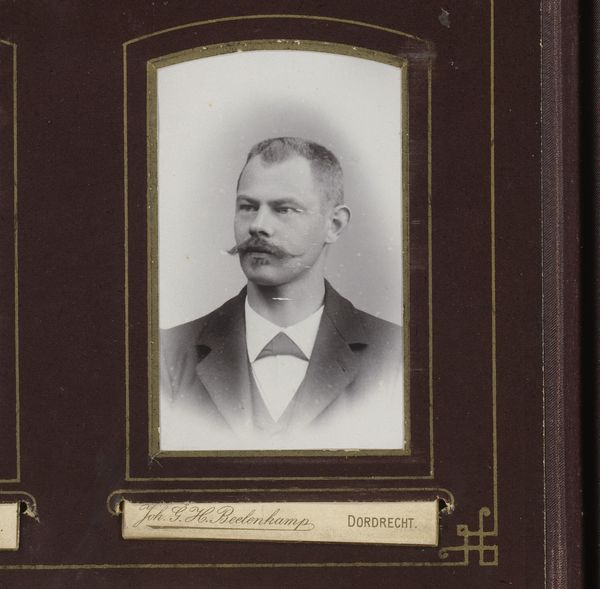 Curator: Right, let's consider this captivating portrait. We believe it to be of a man taken somewhere between 1880 and 1901. The photographic print itself is credited to Hendrik Boonstoppel. Editor: I am immediately struck by the sternness in his eyes. He's gazing out at us from another century, across the sepia tones, as if daring us to understand his world. A quiet strength radiates from this composition. Curator: It's tempting to interpret that sternness, isn't it? Photography of this era often served to solidify one’s social standing. Think about the rigid class structures; photography became a tool, accessible to middle classes, for encoding bourgeois values of self-discipline, respectability and status through visual representation. Editor: And the mustache! That impressive, groomed mustache practically screams, "I'm a man of substance, of distinction." I imagine him twirling it thoughtfully, pondering some grand scheme. I bet he had a terrific sense of humor. Curator: Yes, but beyond mere vanity, the meticulous presentation reflected societal expectations, performing conventional masculine norms to bolster one's legitimacy in patriarchal systems. It reflects gender roles from this period. The gaze could be an indication of internal tensions. Editor: I hadn't thought of that! Yet looking at it now... that tightly buttoned jacket, almost restrictive. Perhaps it reflects a societal restraint, an expectation weighing on his shoulders. And the slightly off-center framing makes it seem as if he might almost break out. Curator: This photograph exemplifies the tensions inherent in portraiture during that era—a desire for personal expression interwoven with a need to conform to dominant power structures. He could be seen as grappling with the push and pull between individuality and collective identity. Editor: You know, thinking about the historical background only enriched the mysterious character that lives on inside the frame. Now I see his severity as a mask for his sensitivity and an entire life, complete with joys and sadness, lived according to times that were hard on most people. Curator: Absolutely. I hope exploring it from social and artistic points broadened the horizons about portraiture’s intricate role. Editor: It really did. I appreciate seeing this photo under that new, interesting light!