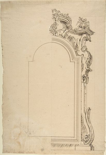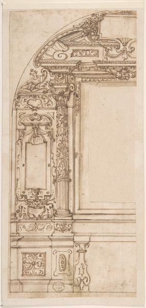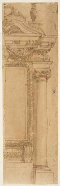 Curator: Look at this stunning "Left Half Design for an Architectural Project" by Mauro Antonio Tesi, created between 1730 and 1766. The artist used pen and brown ink over black chalk. What catches your eye first? Editor: Its incompleteness, the architectural fragment rising from the page, and the almost unsettling level of ornamentation! It speaks of grand aspirations, classical excess even, yet remains just a portion. What sort of building was this imagined for? Curator: Exactly! It points to a world where power and visual impact are paramount. The Baroque style is evident in the twisting column and ornate capital. How does it fit within the socio-political context of its creation? Aristocratic dominance, surely. A display of wealth, power... masculinity. Editor: Indeed. The choice of pen and ink tells us something too. There’s an immediacy and a control inherent in it, unlike preparatory sketches. It almost elevates architectural design to an independent art form. Who would’ve made such choices for architecture beyond the aristocrats and artists in their employ? The column winds with what looks like foliage, but is actually carefully chosen embellishment. Curator: And notice how Tesi doesn’t just present a clean elevation. The shading and shadows provide a sense of three-dimensionality, further enhancing the design's ambition. It's interesting to reflect on the impact of these drawings on society, influencing architectural and political identities of the time. Editor: Consider the production, too. Pen and ink were comparatively accessible materials, pointing to the broadening scope of architectural design beyond just the elite. Tesi likely benefited from growing trade economies in his time. A massification of classical dreams. This is art directly influencing lived experiences, and thus a tangible display of social forces and how they literally create environments and who benefits from those environments. Curator: Absolutely. It makes me consider those left outside of the design—the unnamed workers, the unseen hands, those not considered when visualizing who gets to experience or profit from these spaces. Thank you. Editor: The incomplete form lingers in the imagination... so the unseen labour behind what *could* be done is there too.