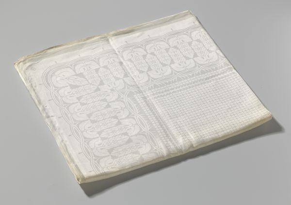 Editor: This is Chris Lebeau's linen damask cloth with hawthorns, created between 1900 and 1925. I find its intricate floral design very soothing, like something from a fairytale. How do you interpret this piece, especially within its historical context? Curator: The cloth represents a fascinating intersection of Art Nouveau and the Arts and Crafts movement's influence on Dutch decorative arts. Consider the period: industrialization was booming, yet there was a yearning for handcrafted items, for nature in the domestic sphere. How does this piece function within the rise of the Dutch middle class during the late 19th, early 20th century? Editor: So it's about bringing art into everyday life, reflecting a desire for beauty and nature amidst industrial change. But why hawthorns specifically? Curator: Hawthorns were popular motifs then. They symbolize hope and resilience. Think about the social role of these textiles. Who would have owned this? Where would it have been displayed? Was it a symbol of wealth or aspiration? Editor: That makes me think about the political implications of choosing natural imagery versus something more overtly symbolic of wealth and power. Curator: Exactly! And that brings up another important point – the rise of museums and design education influenced artists like Lebeau. Public institutions were actively shaping taste and promoting national artistic identity through design. Did the decorative arts influence the national political and artistic aspirations of the rising power of Dutch national identity at this time? Editor: It's amazing how much social and political commentary can be found in something seemingly simple like a table cloth! Curator: Absolutely! Examining objects like these allows us to understand how broader social currents shape even the most intimate aspects of life. I learned a lot too about what shapes public perceptions through this seemingly small but powerful cloth.