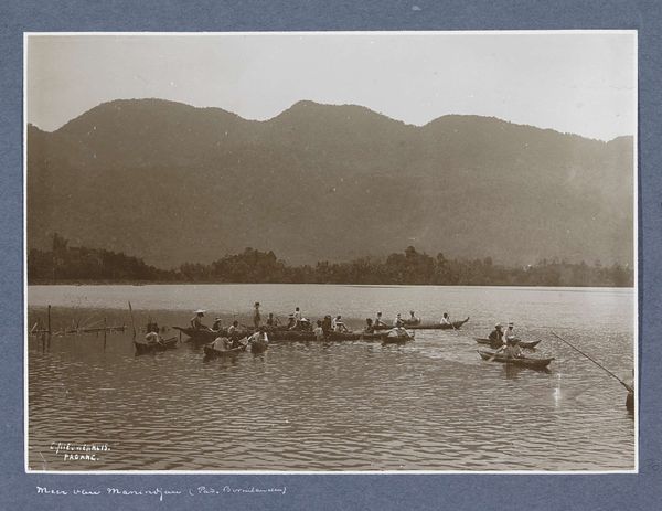 Curator: Welcome. We're looking at "View of Lake Maninjau in Sumatra with agricultural workers in the foreground," a photograph created circa 1900-1920. The artist is Christiaan Benjamin Nieuwenhuis, and it's a gelatin-silver print. Editor: It's beautiful, though subdued. The monochromatic palette lends it a melancholic air. And that haze over the mountains makes you wonder what kind of labor produced this seemingly tranquil scene. Curator: Precisely. Nieuwenhuis's work provides a glimpse into the colonial gaze. As a landscape, it appears serene, yet it’s crucial to consider its context. The Netherlands, with its colonial history in Indonesia, used imagery like this to shape perceptions. Think about who would have had the means to own this photograph and what their socio-political status would be at the time. Editor: I'm immediately drawn to those agricultural workers. Note the physical labor implied in cultivating that foreground. The choice of gelatin-silver process here isn't neutral either; mass reproducibility meant such images could be circulated widely, impacting viewers across social classes and continents and contributing to certain skewed ideologies of colonization. It creates a demand for resources. Curator: Exactly! The 'realism' so-called of the style is constructed and mediated by power dynamics. This isn’t just a snapshot, but a representation crafted with particular narratives in mind that further perpetuate a Western, global view. Editor: Consider the composition, too. The high vantage point, almost paternalistic view reinforces an order that places some at the bottom rung of the socio-economic structure and in this landscape. What tools did they have? What were they growing? I bet those raw materials eventually end up far removed from this place! Curator: The photograph prompts us to reflect on the relationships between labor, representation, and the colonial project itself. It makes us think about what is revealed and, perhaps more importantly, what is obscured. Editor: Right. It’s about peeling back those layers of idyllic landscape to uncover the means of production—the hidden histories etched into every tree, every crop, every shadow in that gelatin silver. I’ll certainly be thinking about Sumatra long after this visit.