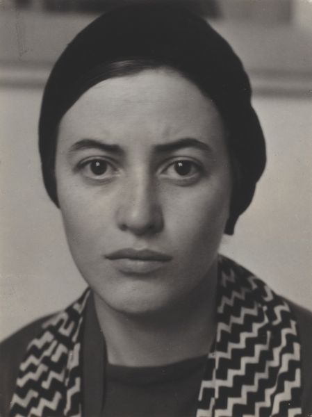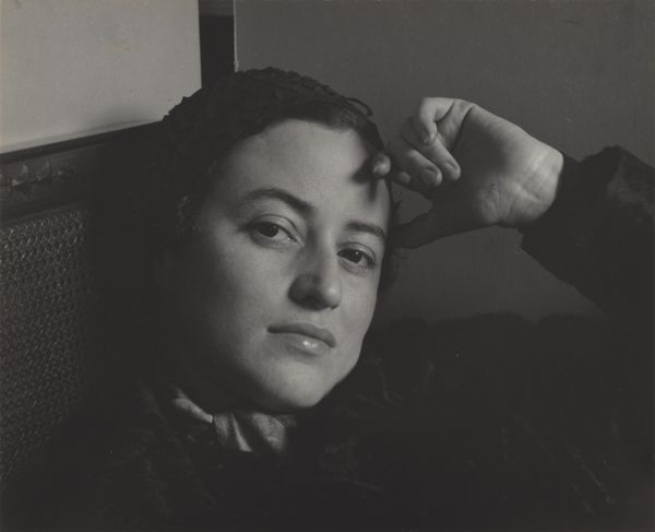 Curator: Right, let's consider this captivating portrait. It’s titled "Helen Freeman," made in 1921 by the celebrated photographer Alfred Stieglitz. Editor: She looks, I don’t know, exhausted but defiant? The light’s all soft, but that gaze is intense. Makes you wonder what’s on her mind, doesn't it? Curator: Indeed. Stieglitz, with his pictorialist sensibilities, was known for imbuing photography with the qualities of painting. It's as though he’s capturing not just a likeness, but a feeling, an essence. Editor: And she's staged almost geometrically. Look how her hand frames her face—the severe angles against that gentle slump of her shoulders… There’s a story hidden in that tension, maybe something about female strength and societal pressure? Curator: Perhaps. Stieglitz often photographed the women in his life. Helen Freeman, like Georgia O’Keeffe, likely represented a muse, an embodiment of modern ideals during a period of profound social and artistic change. There’s a visual and cultural language he uses that positions her. Editor: Right, she's propping up her chin... It’s the classical pose for melancholy or thoughtfulness. Almost cliché, yet, with Stieglitz, you get a sense it's intentional, right? A reclaiming of older tropes for new emotions. A statement. Curator: Precisely. By referencing historical poses while embracing the stark realism of photography, Stieglitz collapses time, invites comparison, and, dares I say, asserts his own artistry. Think of photography still battling to be recognised as an art in this period. Editor: It's pretty striking, to drag those old symbols, kicking and screaming, into modern times. She looks drained by the struggle... Maybe she needed a nap like the rest of us do, the poor woman! Curator: Maybe. On that thought, it feels like an opportune moment to consider what this powerful portrait signifies to us as we walk away. Editor: True. As long as you're doing more than propping your chin up, right? See the world a little differently because of her?